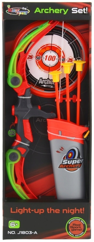 Набор для стрельбы из лука доставит вашему ребенку массу удовольствия как дома, так и на природе. Лук натянут на резинку, которую можно отрегулировать по своему усмотрению. Кнопка, расположенная в центре дуги, активирует 3 различных световых эффекта, которые сделают веселье еще более привлекательным. Каждая стрела имеет на конце резиновую присоску, что делает игру абсолютно безопасной. Щит обогатит соревнование в получении максимально возможного результата, а колчан с поясом облегчит хранение и переноску всего комплекта.