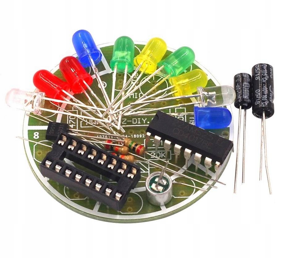Микрофон преобразует звуковой сигнал в электрический сигнал, который, усиливаясь транзисторами и счетчиком, возбуждает светодиоды.