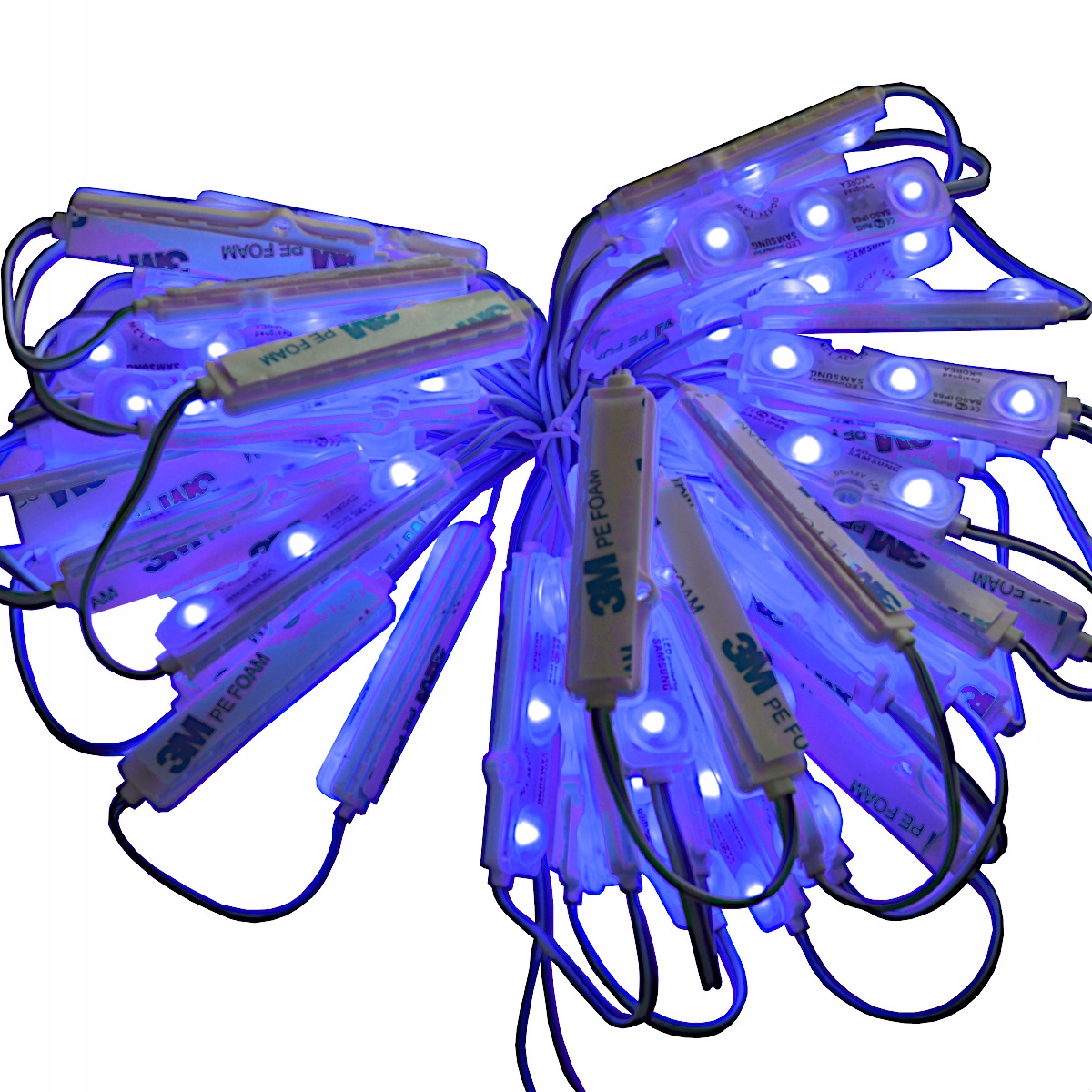 Светодиодный модуль 5730, пластиковый, 3-диодный, с диодами Samsung, водонепроницаемый IP68, с очень высокой яркостью света, напряжение питания DC 12В, ток потребления 1,2Вт/модуль, размеры: 67х14х8 мм, с рассеивающей линзой, угол освещения 160 градусов. Модули соединяются последовательно, по 25 штук, кабелями длиной примерно 7 см. Цвет подсветки синий. Способ крепления - винты через монтажные отверстия в модуле или двусторонний скотч 3М (приклеивается к модулям с нижней стороны).