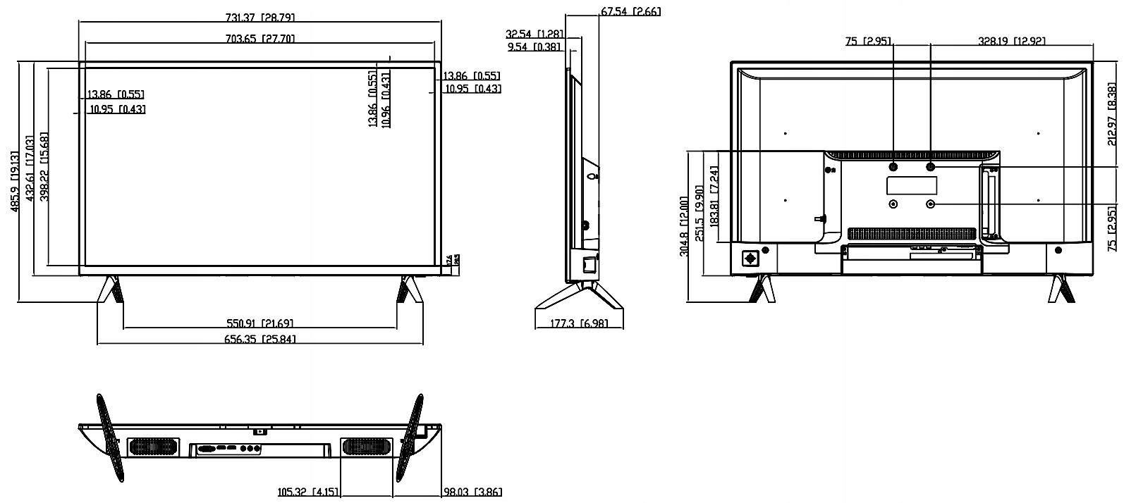 - Измерения: 731 x 485 x 177 мм (с подставкой), 731 x 433 x 68 (без стенда)