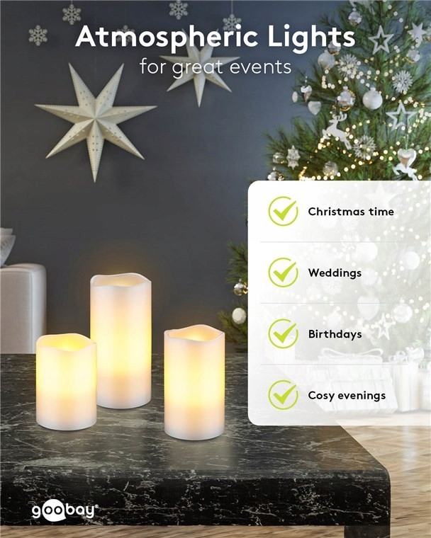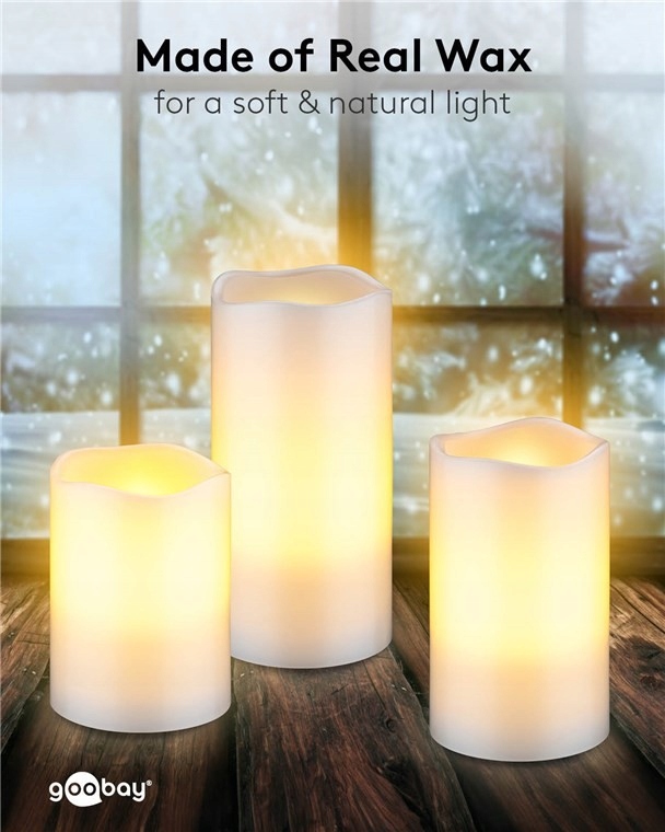 - Стильные свечи в трех разных размерах, обеспечивающих теплый свет свечей с естественным мерцающим пламенем - полностью электрическим и совершенно безопасным