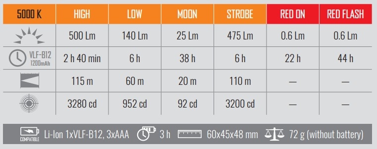 ▪Режимы работы: 6 (высокий, низкий, луна, стробоскоп, красный свет, красная вспышка)