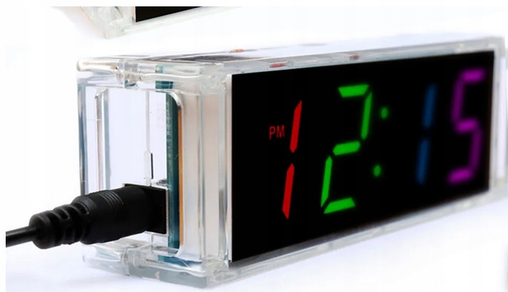 Питание осуществляется от разъема USB напряжением 5В (кабель в комплекте). Часы имеют прозрачный корпус, что придает им интересный и современный вид.