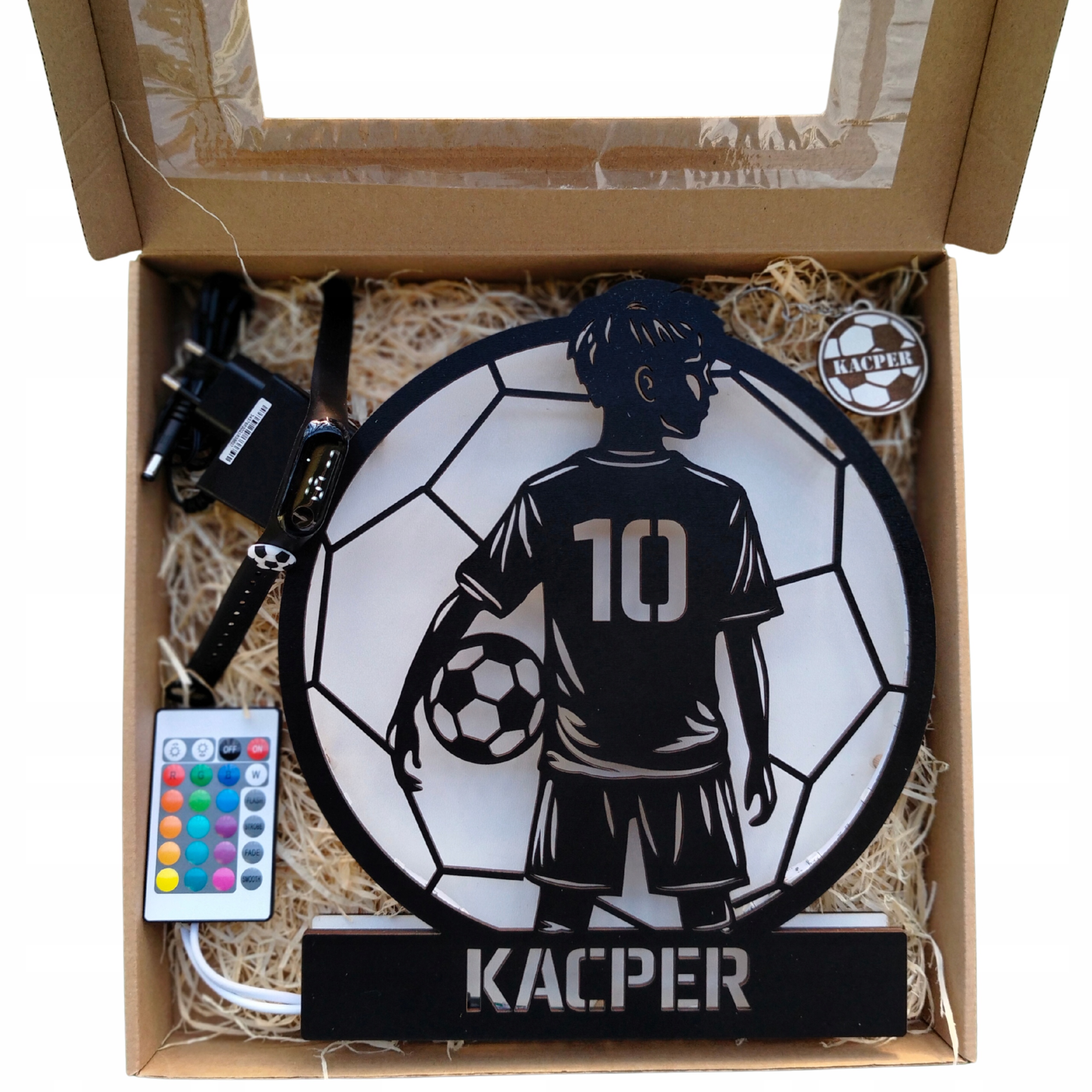 Именная светодиодная лампа с именем – отличное украшение комнаты маленького футболиста. Освещение работает от сети, поэтому вам не придется забывать о замене батареек. Управляется с помощью пульта дистанционного управления, позволяет выбирать до 16 цветов освещения, включать или выключать его можно, не вставая с кровати.