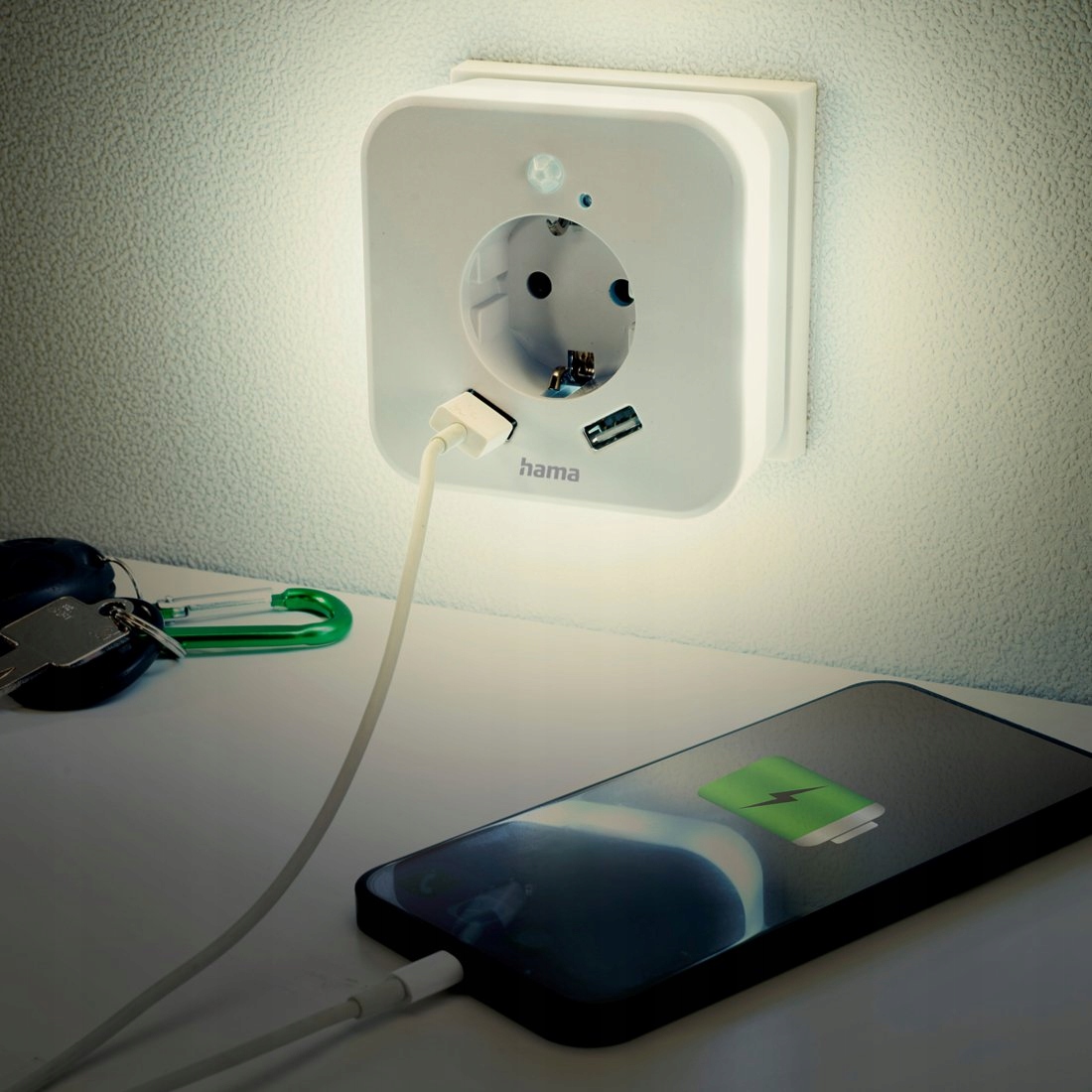 СВЕТОДИОДНЫЙ НОЧНИК HAMA С РОЗЕТКОЙ 2 USB-ВЫХОДА ДАТЧИК ДВИЖЕНИЯ И СВЕТА