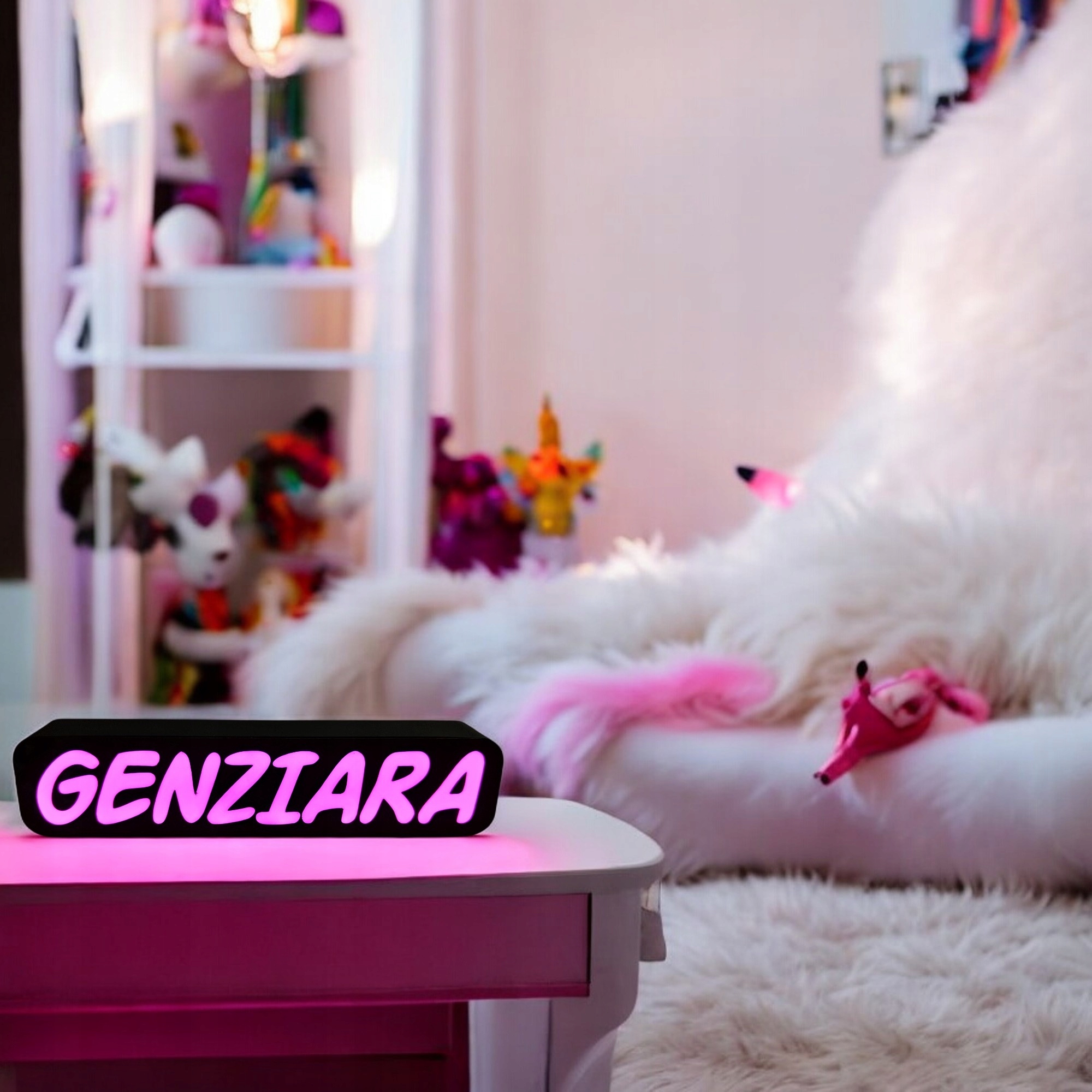 - Неоновая надпись: Розовая надпись «GENZIARA» притягивает взгляд и создает уютную атмосферу. Идеально подходит для поклонников Genzie!