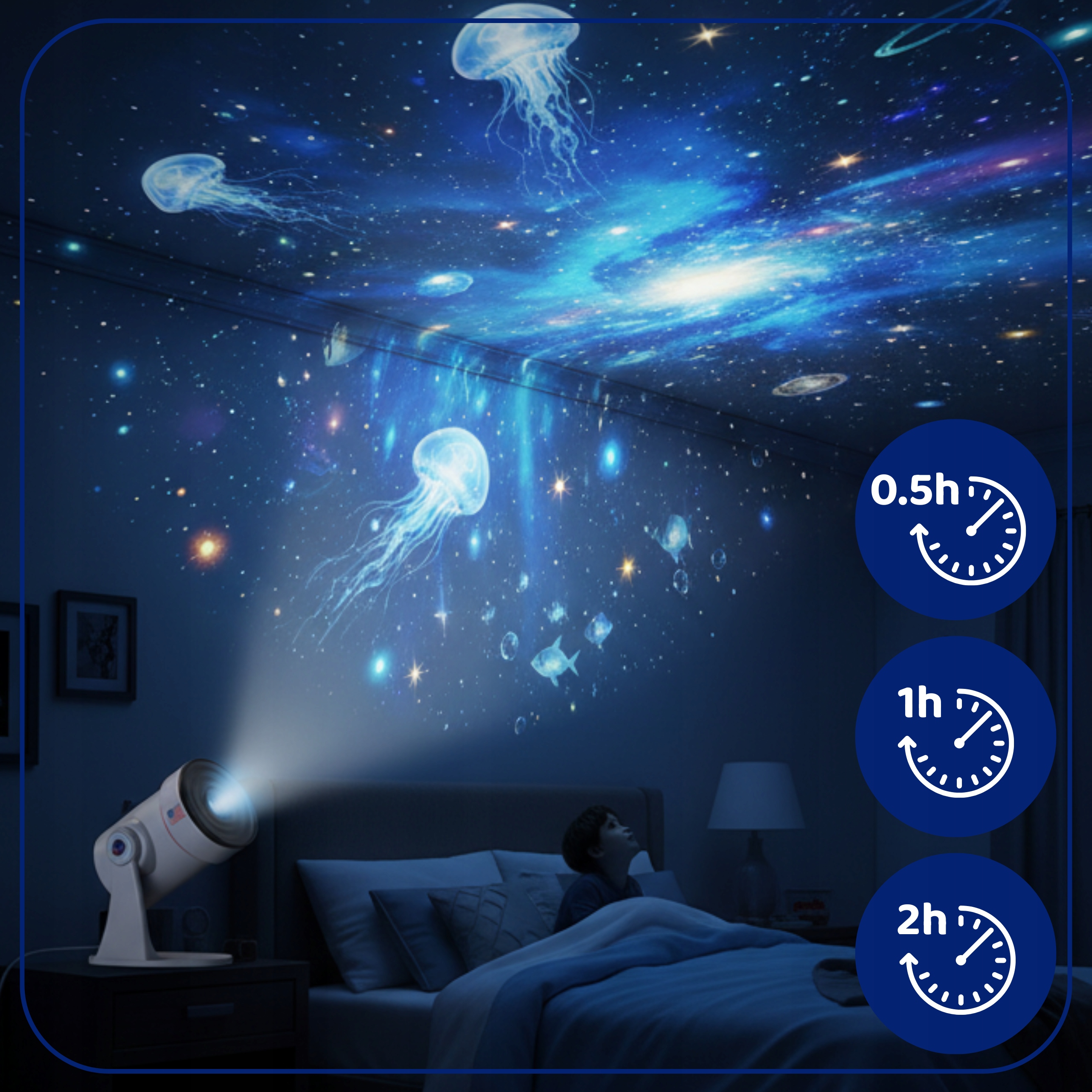 Проектор оснащен удобной функцией таймера, благодаря которой вы можете настроить автоматическое выключение устройства через 0,5 часа, 1 час или 2 часа. Это идеальное решение при засыпании или отдыхе — проектор сам выключится, когда вы заснете, обеспечивая полный комфорт использования и экономию электроэнергии.
