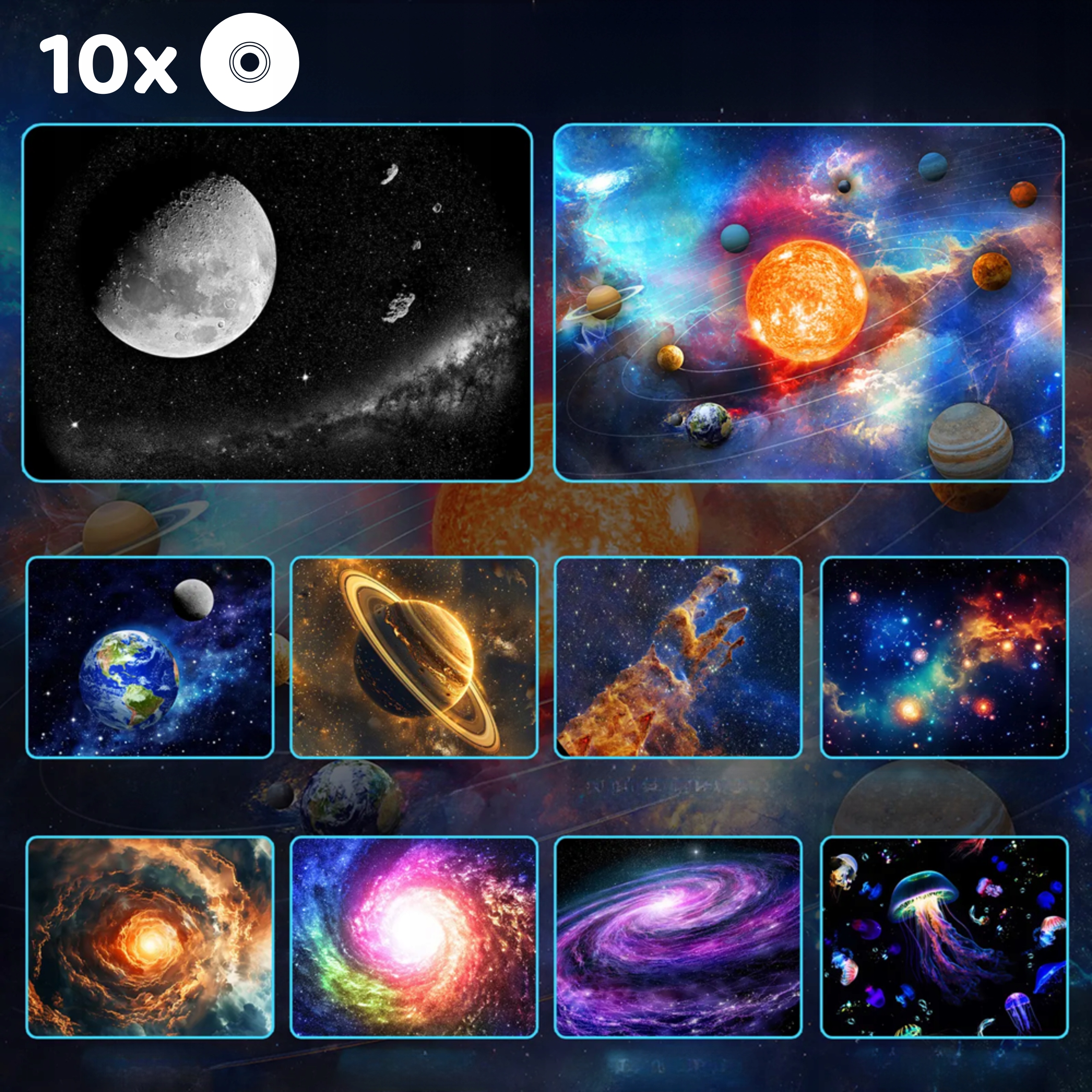 В комплект входят 10 уникальных проекционных дисков, которые перенесут вас в различные уголки космоса: