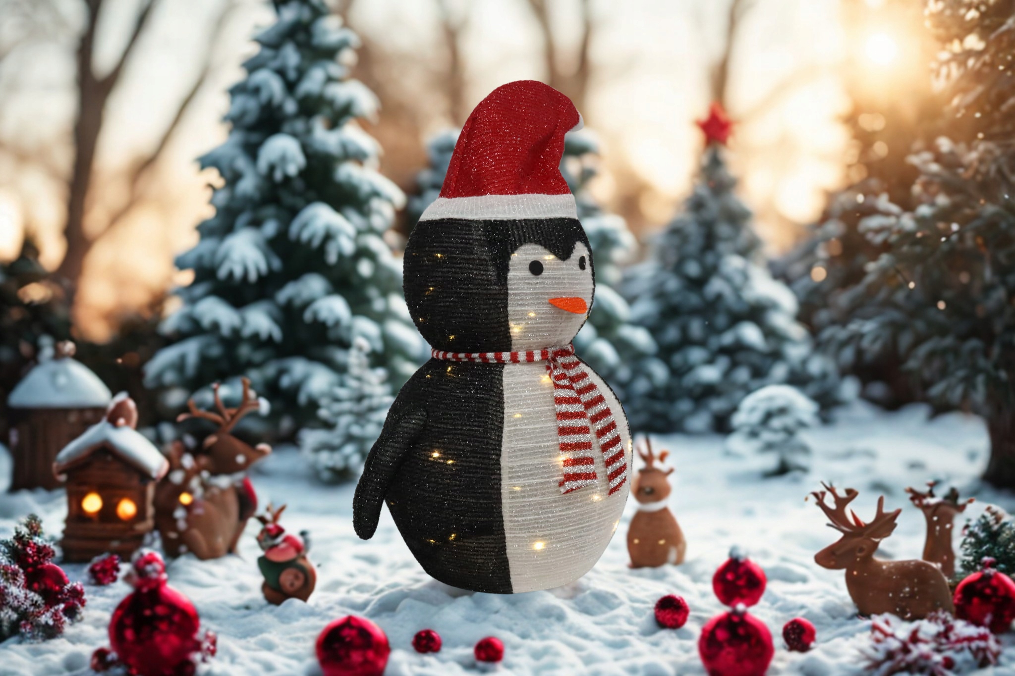 Милая новогодняя игрушка в виде пингвина, украшенная светодиодными лампочками, излучающими теплый свет. У пингвина красный полосатый шарфик и шапка Санты, что придает ему неповторимый, зимне-рождественский характер. Это прекрасное украшение, которое привнесет в обстановку радость и дружескую атмосферу.