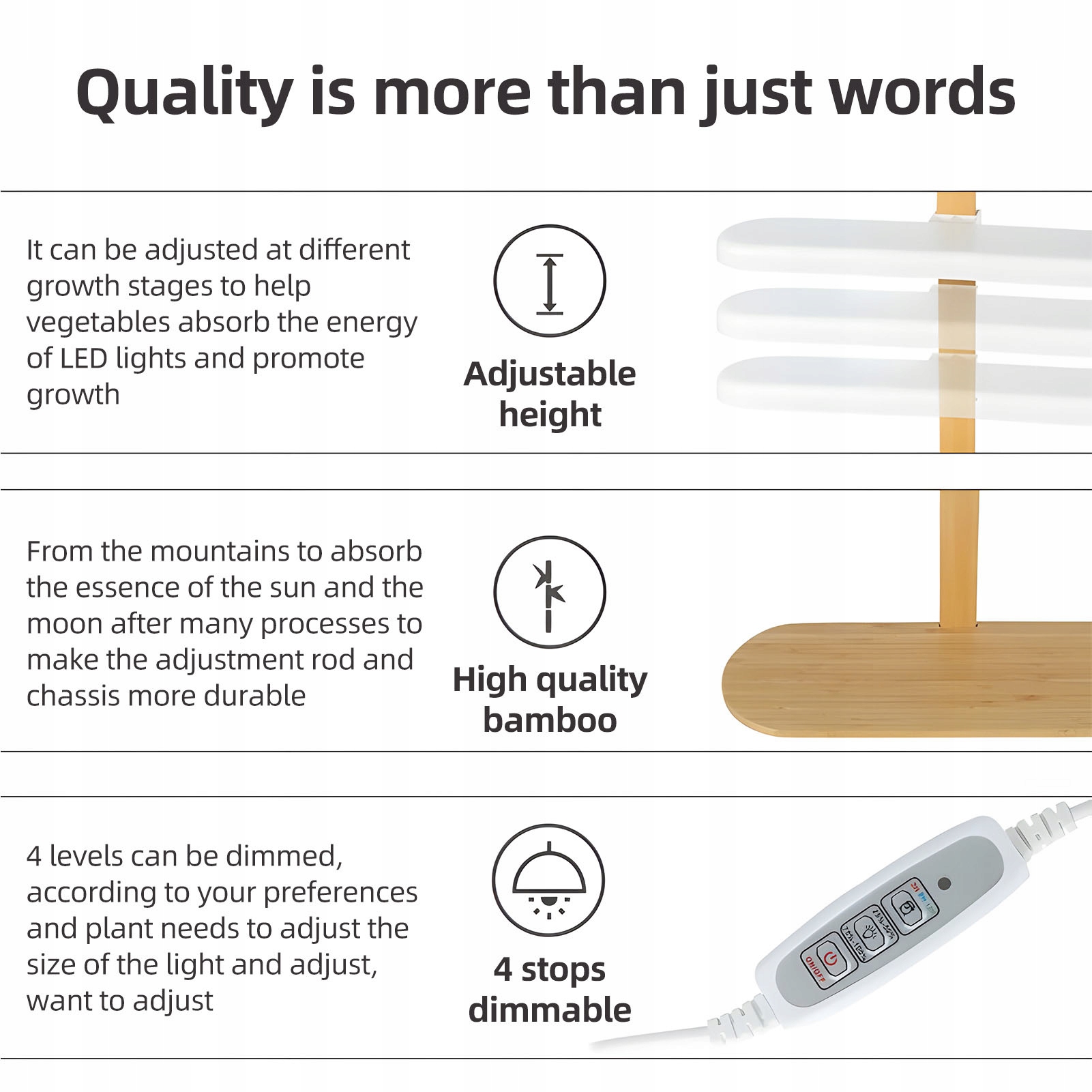 1. 【Высококачественный светодиодный светильник для растений】: этот настольный светодиодный светильник малого спектра мощностью 10 Вт для бамбуковых растений предназначен для комнатных растений. Благодаря регулируемой яркости и функции таймера на 2/4/8 часов он обеспечивает оптимальные условия освещения на разных стадиях роста растений. Высоту света также можно регулировать, что обеспечивает гибкое расположение и легкий уход за растениями.