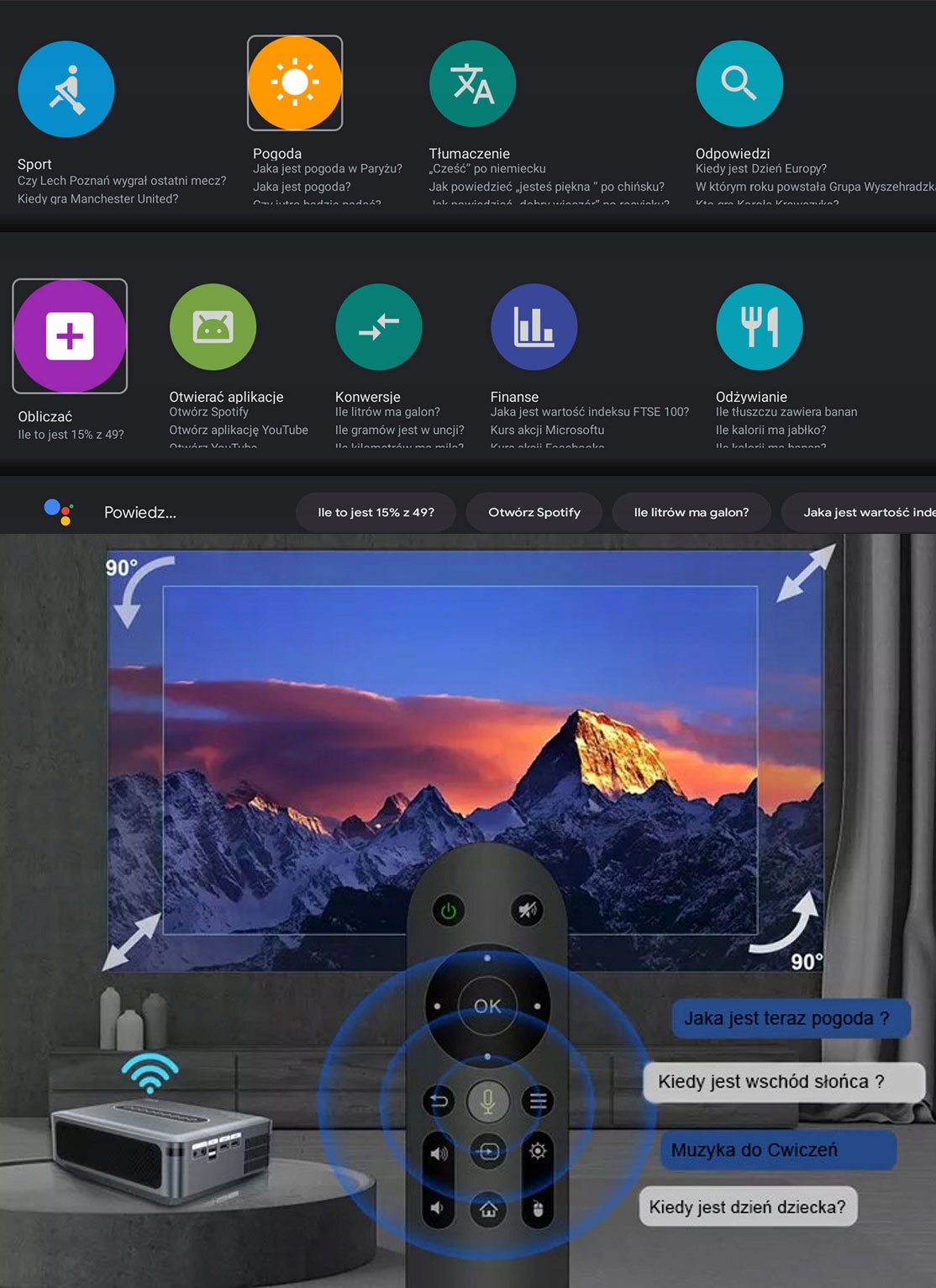 ⭐Проектор поставляется с пультом дистанционного управления, благодаря которому мы можем легко перемещаться по меню устройства. Пульт дистанционного управления работает через Bluetooth и инфракрасный порт, а также имеет встроенный микрофон, позволяющий использовать Google Assistant.
