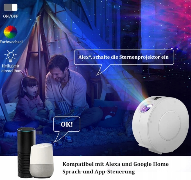 - В режиме Wi-Fi проектор совместим с Alexa и Google Home. Отправьте голосовую команду, чтобы включить проектор галактики, и просто скажите: «Включи звездный свет», «Включи синий», «Установи яркость на 50%», чтобы вы могли наслаждаться режимом громкой связи и прекрасным видом на звездное небо в любое время.