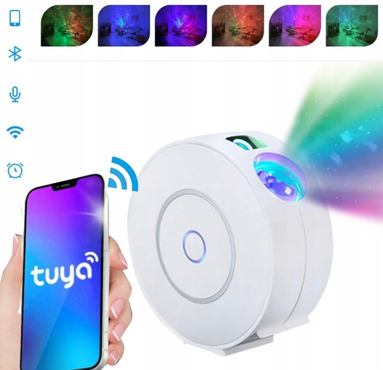 - Умным проектором звездного неба можно управлять через приложение. В режиме приложения вы можете управлять проектором с помощью приложения Smart Life на своем телефоне. Вы можете выбирать разные цвета, устанавливать время, регулировать яркость, устанавливать цветовую сцену, регулировать скорость движения галактического облака в соответствии с вашими потребностями. Причем управлять режимом можно с помощью кнопок на устройстве.