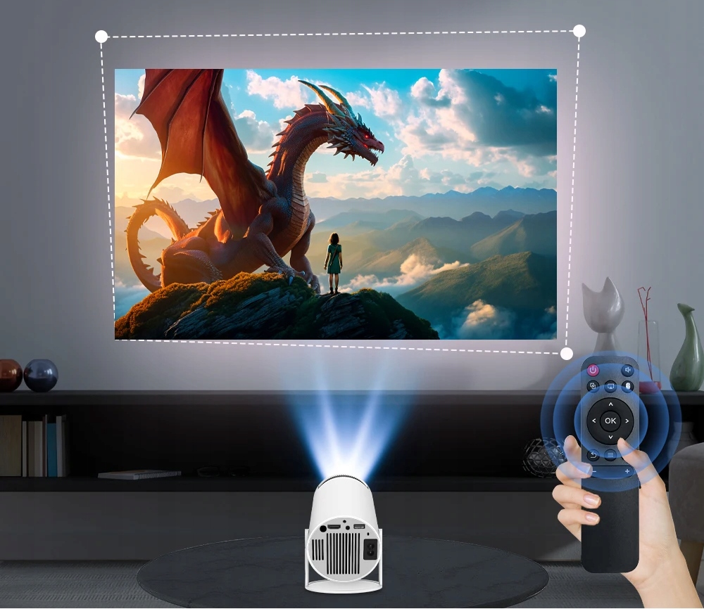 Проектор использует технологию автоматической коррекции трапецеидальных искажений, встроенный высокоточный датчик, обнаруживает движение в реальном времени и фокусируется быстрее и точнее. После включения проектора используйте ручную фокусировку. Он может автоматически корректировать изображение сверху вниз. Если вы хотите настроить боковую проекцию, используйте пульт дистанционного управления.