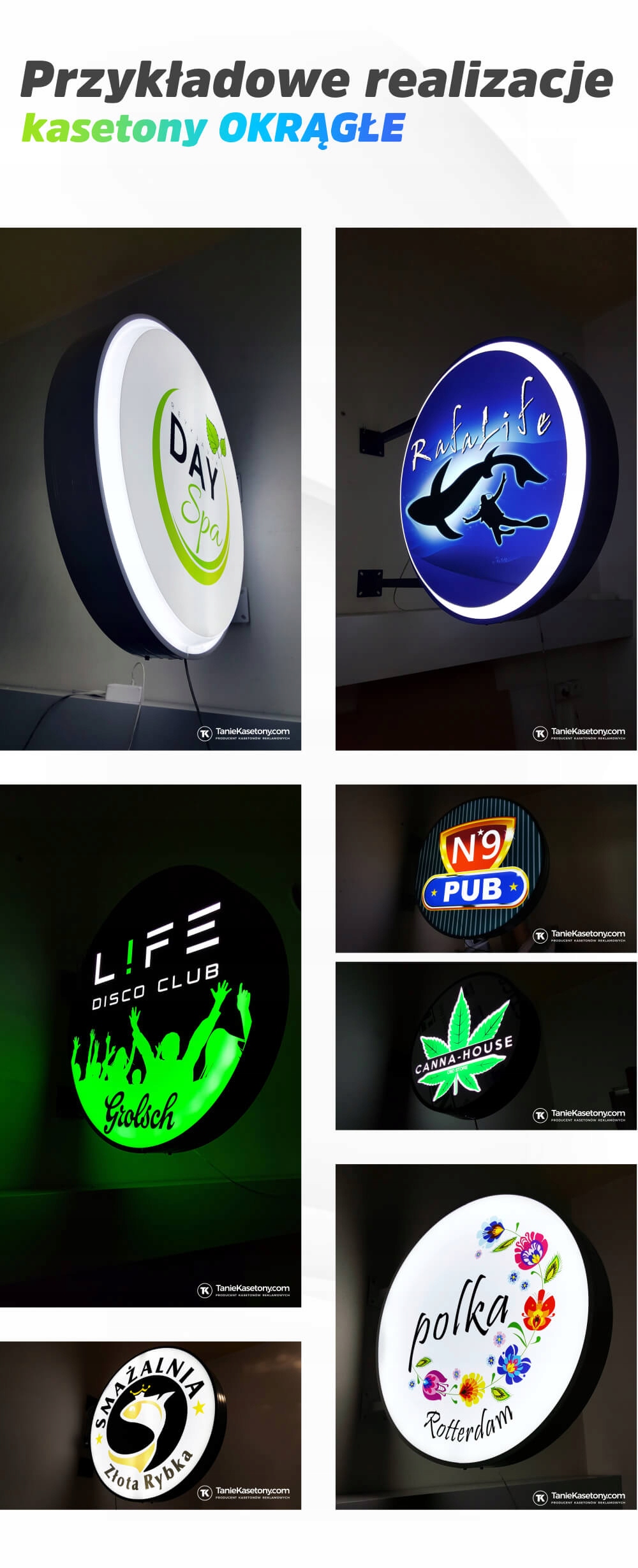 Наши КРУГЛЫЕ световые короба состоят из двух пневматически изогнутых элементов кессонного профиля. В нашем предложении имеются кассеты диаметром 50, 75 и 100 с рамкой 10 см и 100, 120 и 150 с рамкой 14 см в одностороннем и двустороннем исполнении. Другие диаметры доступны при минимальном объеме производства 10 штук.