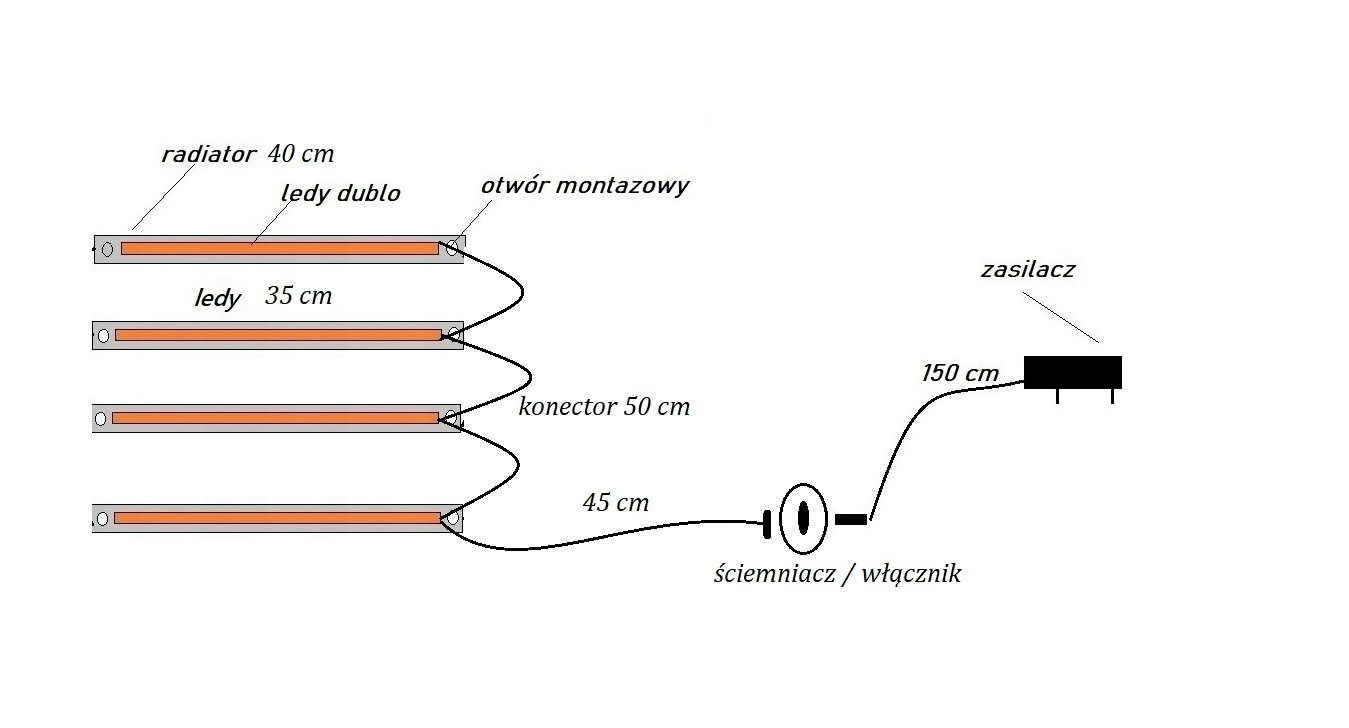 Набор, состоящий из модулей 4 40 см,. С проводами для параллельного соединения. Это решение позволяет любому расположению освещения.