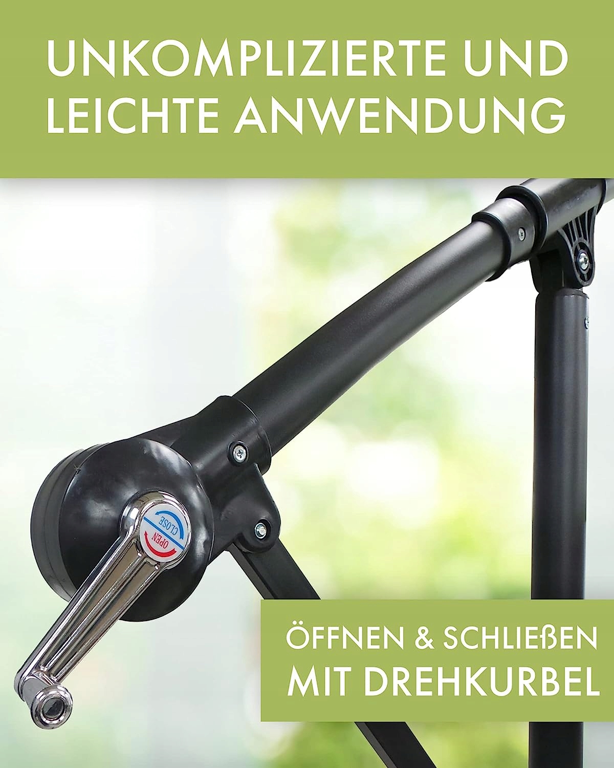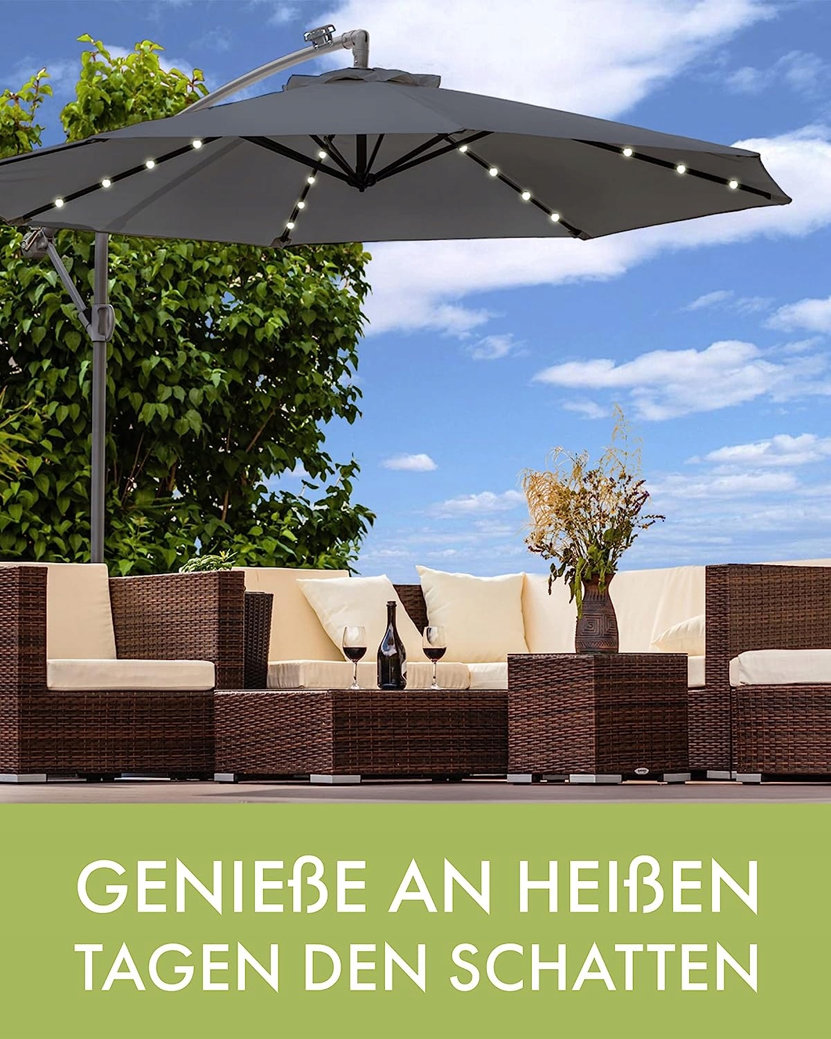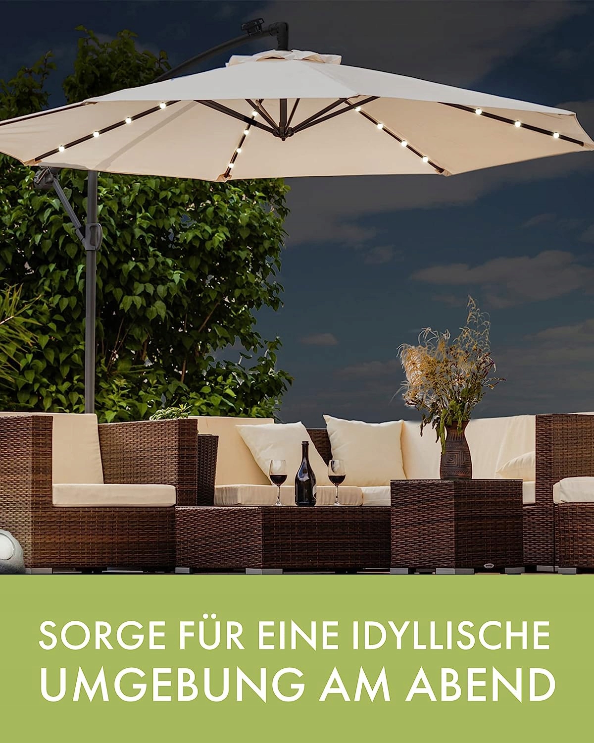 Садовый зонтик на буме со светодиодами и подставкой из высококачественных материалов с руководителем для легкого и удобного складывания. Светодиоды заряжаются солнечной батареей, поэтому вам не нужен дополнительный источник питания от электрической установки. Зонт устойчив к погодным условиям и ультрафиолетовым излучениям. Очень простой и удобный способ складывания и складывания с помощью рукоятки. Легко хранить. Верхняя часть зонтика имеет отверстие вентиляции, которое обеспечивает циркуляцию воздуха.