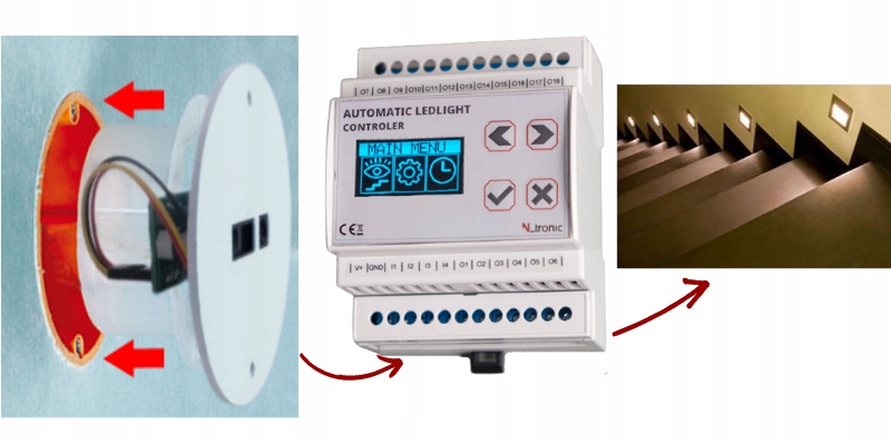 Благодаря наличию входов для 4-х датчиков движения, два датчика движения можно использовать на площадке для активации направления пути, по которому мы идем. Это исключает эффект ненужной подсветки всей лестницы.