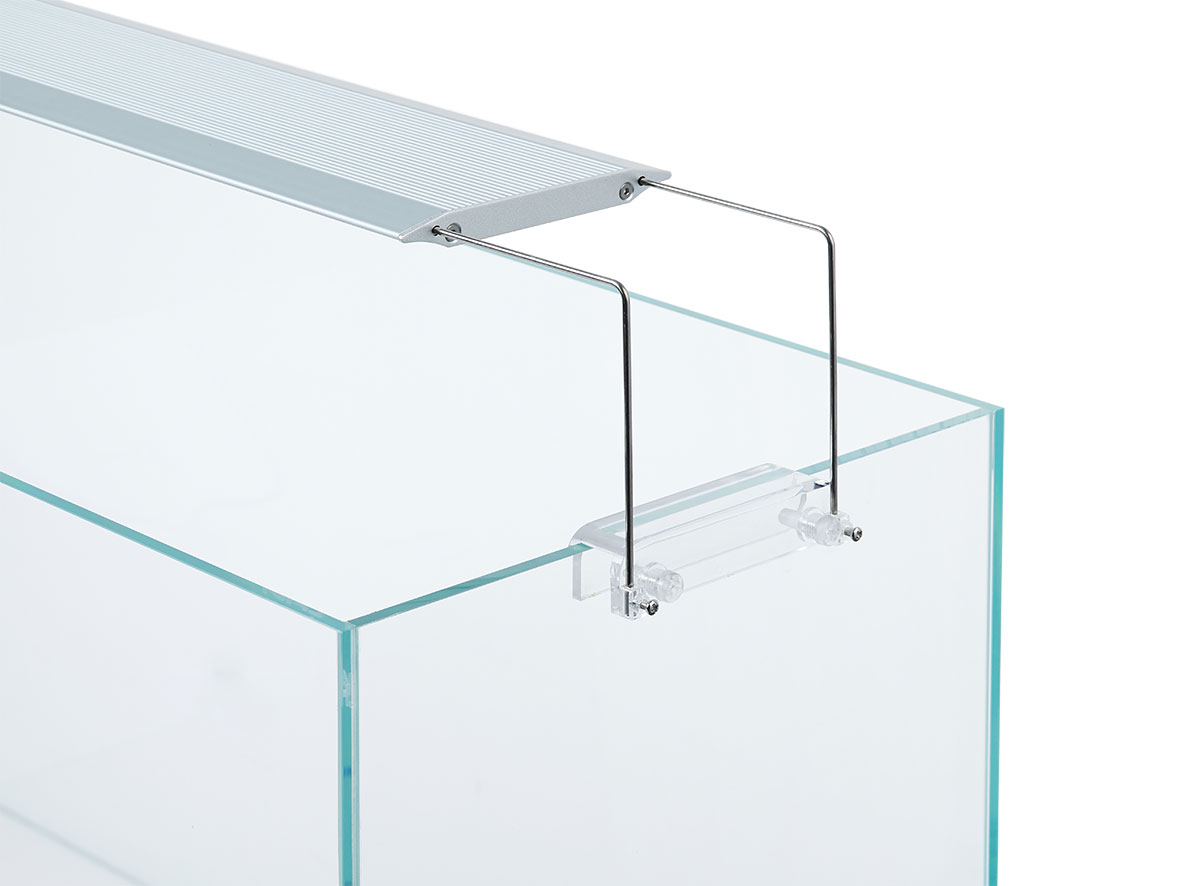 Подсветка крепится на стекло резервуара с помощью прилагаемых аксессуаров. Металлические ножки позволяют регулировать высоту балки, а пластиковые держатели стаканов подходят для аквариумов с толщиной стекла от 5 до 15 мм.