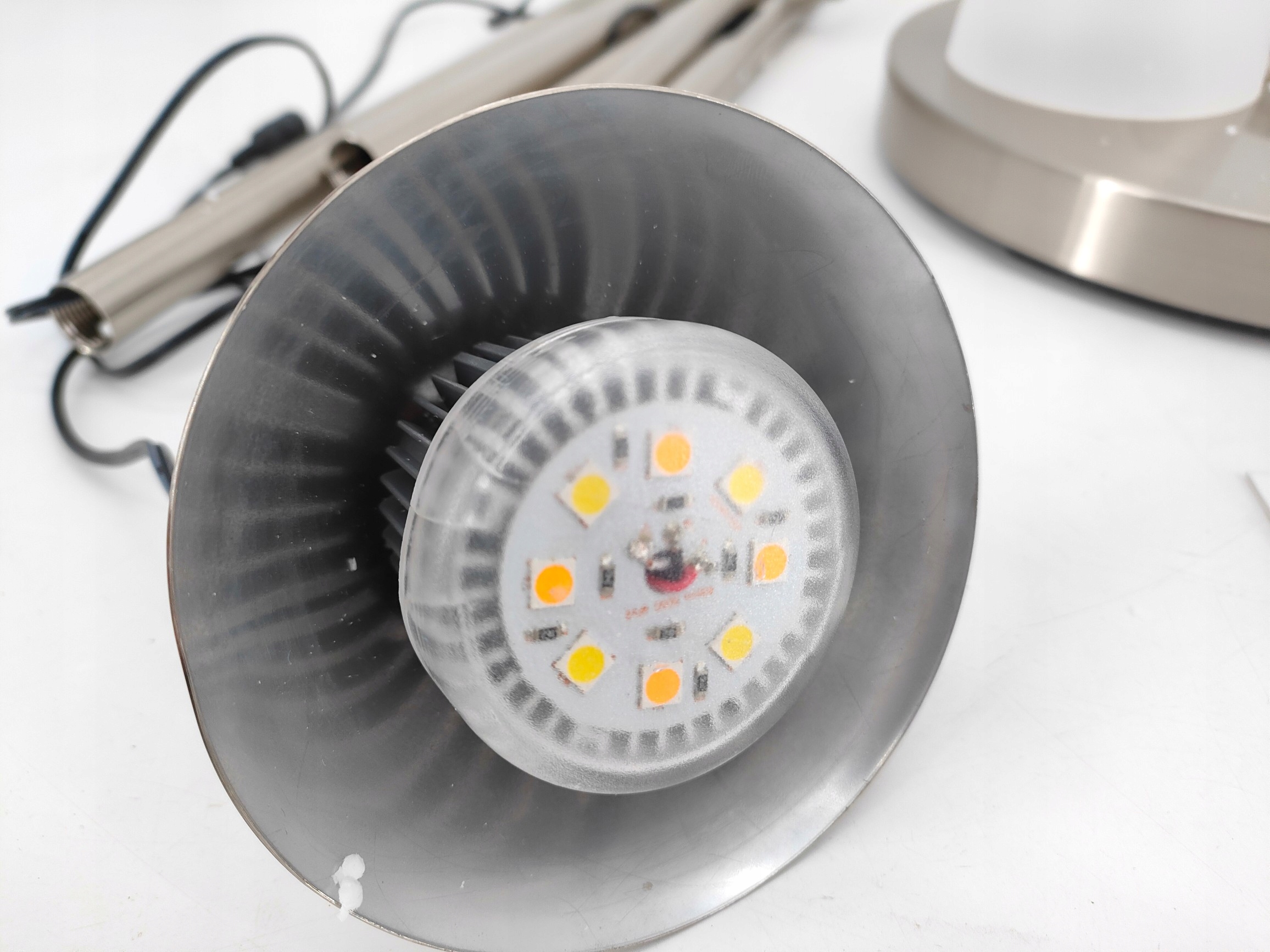 - Две ламповые головки: лампа имеет две отдельно управляемые ламповые головки, лампа оптимально освещает помещения. Оснащенный светодиодными лампами, светильник экономичен и безопасен для глаз.