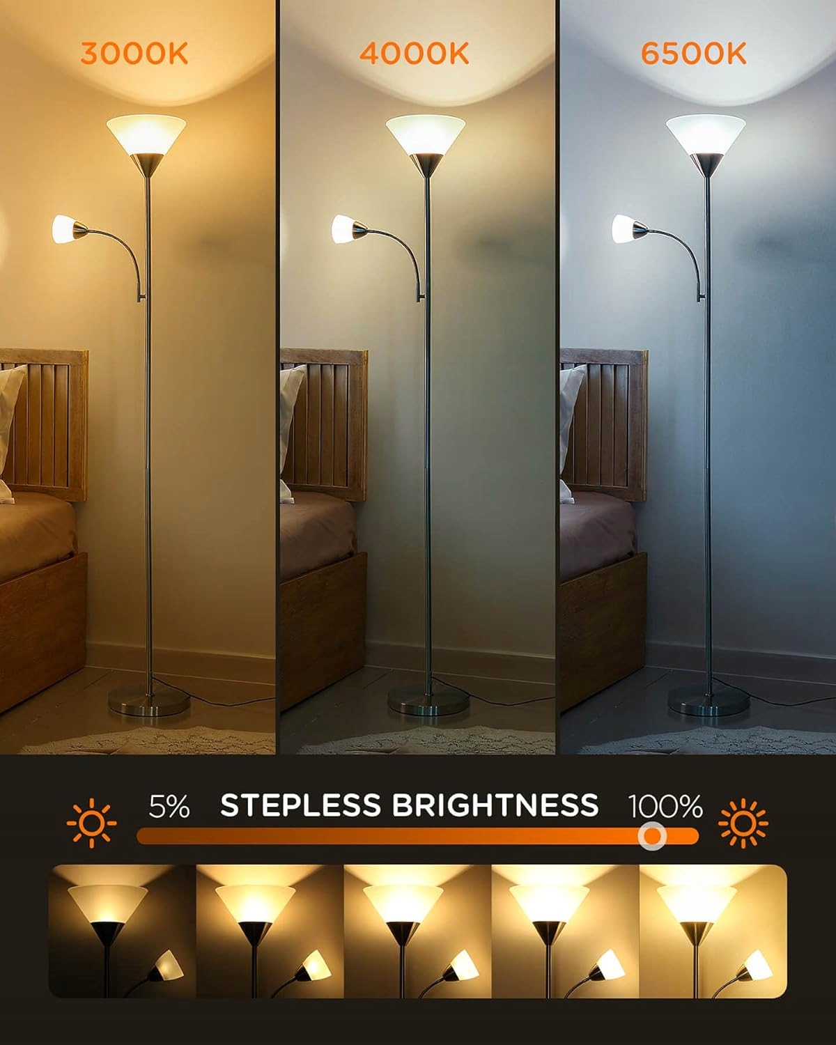 - Бесступенчатая регулировка яркости: торшер имеет 3 различные цветовые температуры. Яркость можно плавно регулировать. Благодаря этому вы можете настроить оптимальные условия освещения для каждой ситуации.