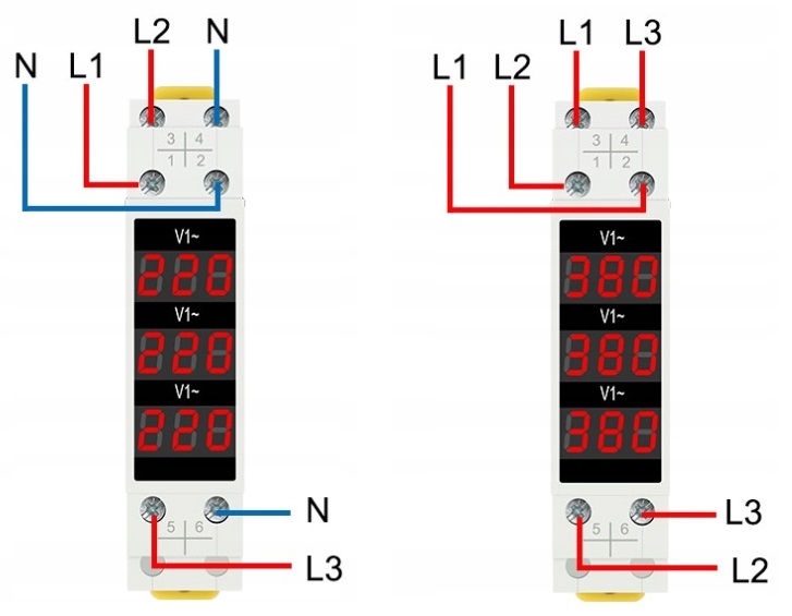 Прибор предназначен для измерения сетевого напряжения 50 - 60 Гц. Он может измерять напряжение относительно провода N или между фазами.