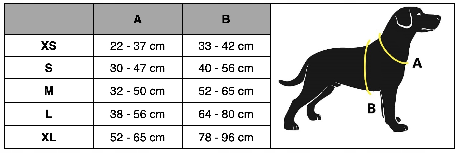 - Окружность собаки следует измерить в местах, показанных на рисунке ниже, и выбрать подходящий размер в соответствии с описанным диапазоном.