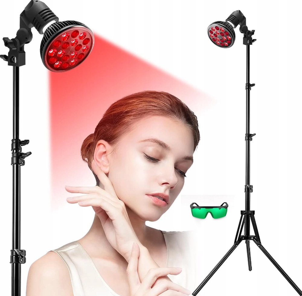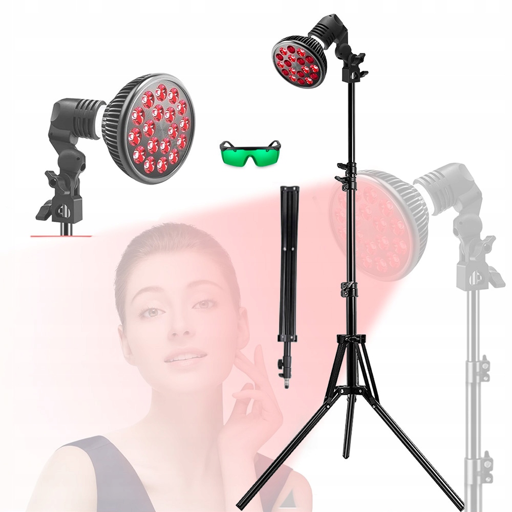 Лампа высокой интенсивности и комбинированная длина волны: лампа красного света высокой интенсивности мощностью 54 Вт состоит из 18 красных светодиодов с длиной волны 660 нм и светодиодов ближнего инфракрасного диапазона с длиной волны 850 нм (невидимых невооруженным глазом). Это оптимальная комбинация длин волн для терапии красным светом лица. Оказывает положительное влияние при проблемах с кожей, снимает усталость и боль. В комплект входят качественные защитные очки.