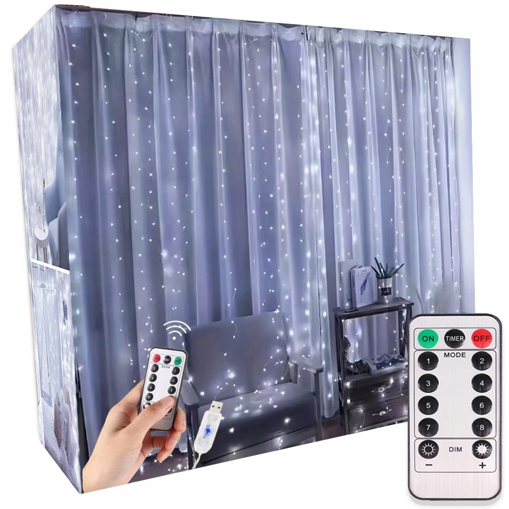 СВІТЛОВА ЗАВІСА 3Х3М ЛАМПИ 300LED ХОЛОДНИЙ БІЛИЙ 8 ПРОГРАМ ПУЛЬТ ДИСТАНЦІЙНОГО КЕРУВАННЯ + ГАЧКИ