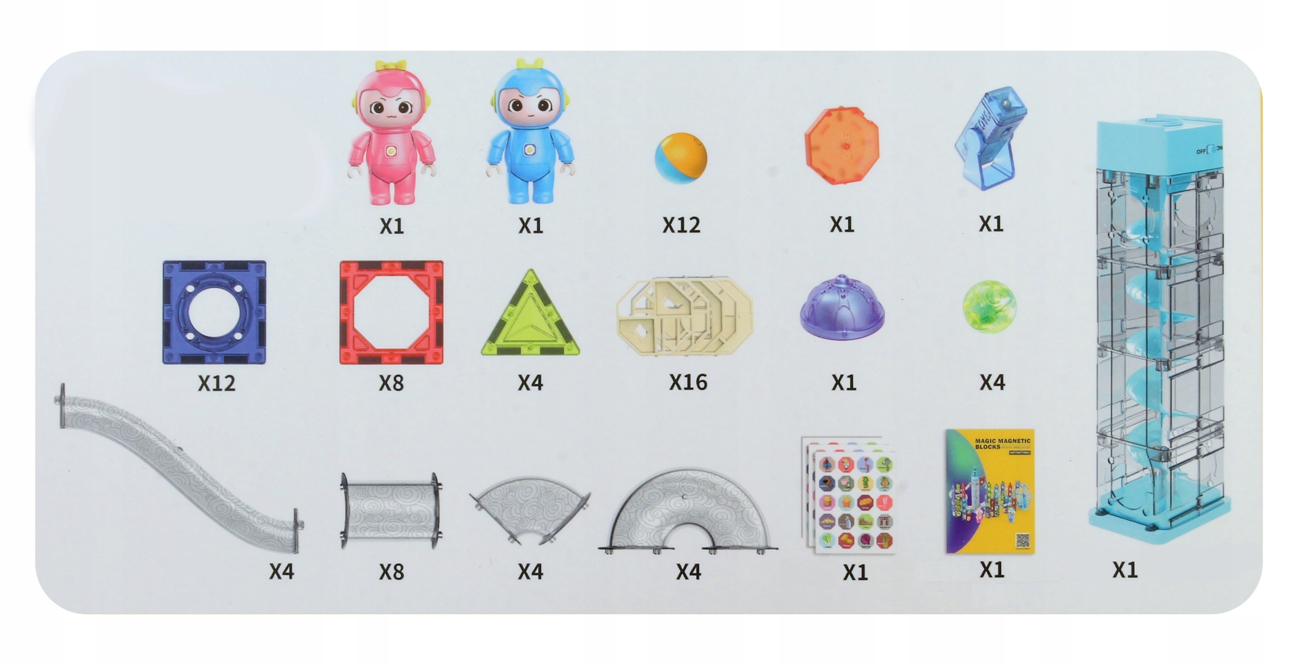 У магнитных блоков есть одно главное преимущество: отсутствие ограничений в построении или изобретении фигур, форм и структур. Единственное ограничение — это количество имеющихся у вас элементов. Наш большой набор состоит из 82 элементов, из которых можно строить различные фигурки. А если вы новичок и у вас еще нет идей, вы можете воспользоваться советами, найденными в специальном буклете.