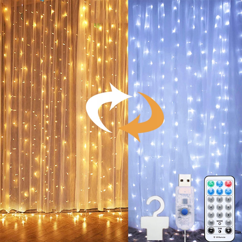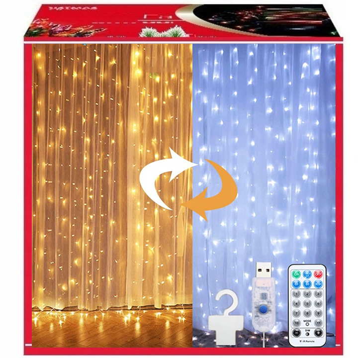 ДВУХЦВЕТНАЯ ШТОРА, ЕЛОЧНЫЕ ОГНИ С ДИСТАНЦИОННЫМ УПРАВЛЕНИЕМ - теплый желтый и холодный белый 2в1