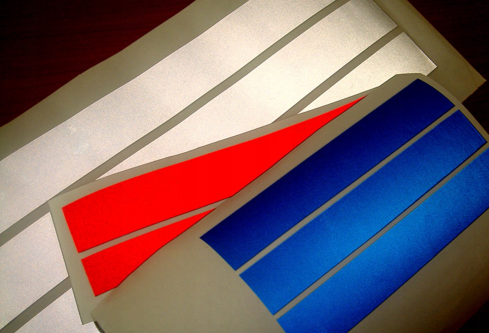 Полоски изготовлены из тонкой самоклеящейся светоотражающей фольги, используемой в рекламной индустрии при производстве рекламы. доски, витрины и для оклейки автомобилей. . Фольга устойчива к внешним погодным условиям, таким как мороз, дождь или высокая температура.