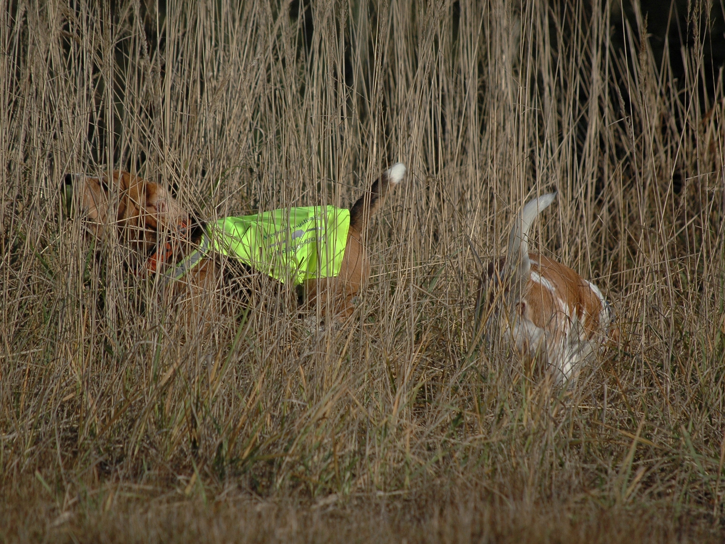 Яркий материал и две светоотражающие полосы делают собаку хорошо заметной для других охотников даже в густой траве и кустах, а также после сумерки.