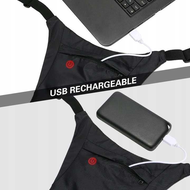 Жилет оснащен литиевой батареей, заряжаемой с помощью встроенного USB-кабеля, который можно подключить к USB-порту ПК, ноутбука, блока питания или зарядного устройства для телефона.
