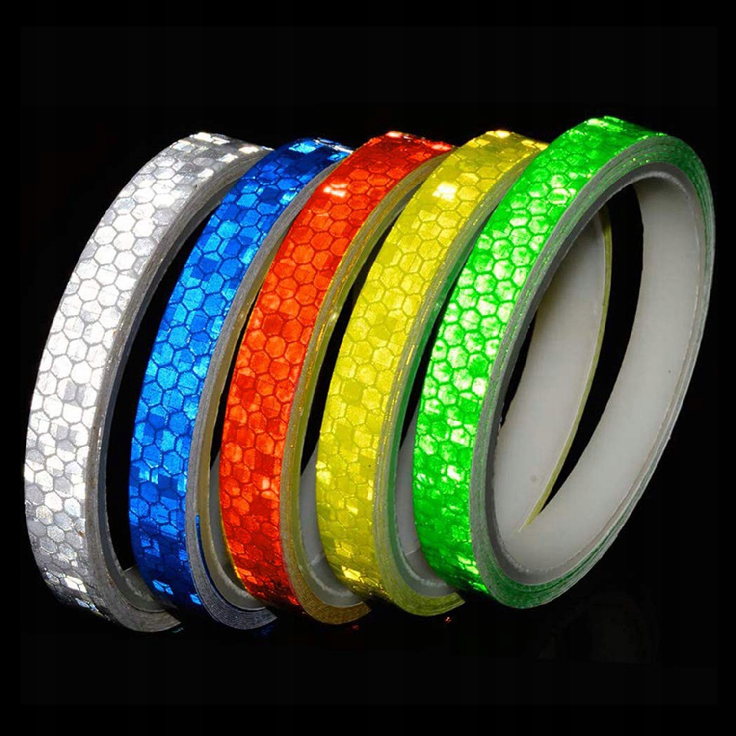 ▶В комплект поставки входят: 5 штук светоотражающей ленты (белая, желтая, зеленая, красная, синяя). Каждая лента имеет длину 8 метров и ширину 1 сантиметр.