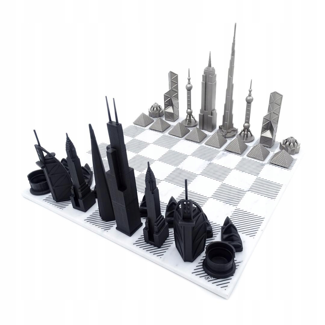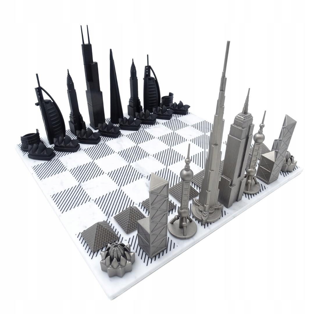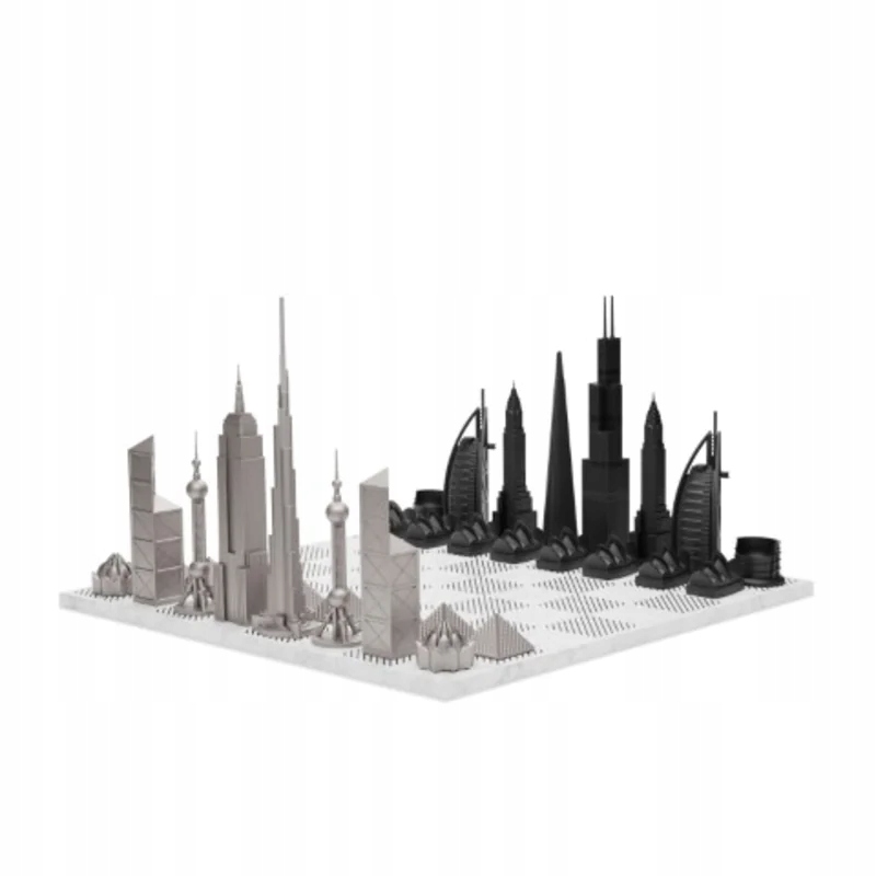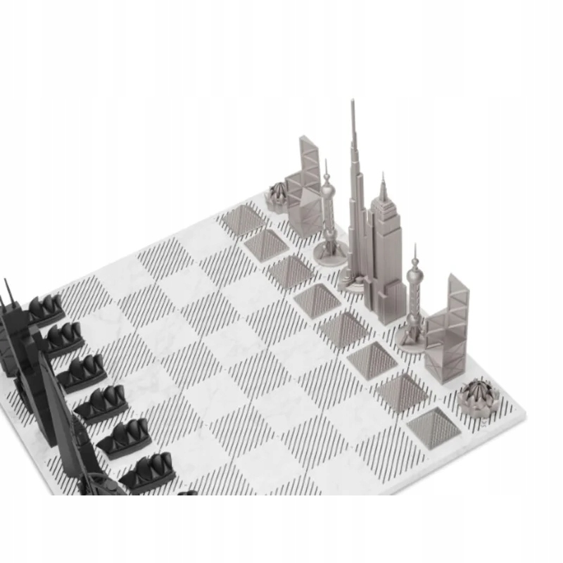 Эксклюзивные шахматы из нержавеющей стали на горизонтской шахматной доске - эксклюзивные шахматные иконы шахматного шахматного мирового мира - это уникальное украшение, чьи фигуры отражают самые известные здания в мире, такие как Empire State Building, Coloseum или Burj Khalifa. Фигуры изготовлены из нержавеющей стали и хранятся в дизайнерском стиле. Целое дополняется красивой мраморной шахматной доской. Набор был сделан из материалов высочайшего качества. Эти шахматы являются идеальным даром для любителей культуры и архитектуры, а также идеальный способ развить навыки стратегического и логического мышления. Они также будут необычным украшением любой гостиной или офиса. Спецификация продукта: Размеры шахматной доски: 38 x 38 x 9 см. Высота высшей фигуры (Burj Khalifa) -22 см. Фигуры, отлитые вручную из сплошной фигуры из нержавеющей стали, приклеенной декоративным войлоком с белой и белой мраморной шахматной доской. Khalifa (Dubai) · Пешки - пирамида Luwr (Paris) · Башня - Храм Лотоса (Дели) · Skoczek - Банк китайской башни (Гонконг) · Гонист - Восточная жемчужная башня (Шанхай) Черные фигуры: · Хетман - Шард (Лондон) · Крол Сидней · Башня - Колизей (Рим) · Скоцкек - Бурдж Аль -Араб (Дубай) · Гонист - здание Крайслера (Нью -Йорк)