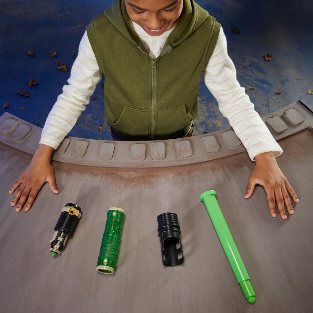 Этот неэлектронный световой меч состоит из четырех частей — выдвижного зеленого лезвия, колпачка, гарды и сердечника. Дети могут собрать свой собственный световой меч и участвовать в воображаемых дуэлях по всей Галактике!