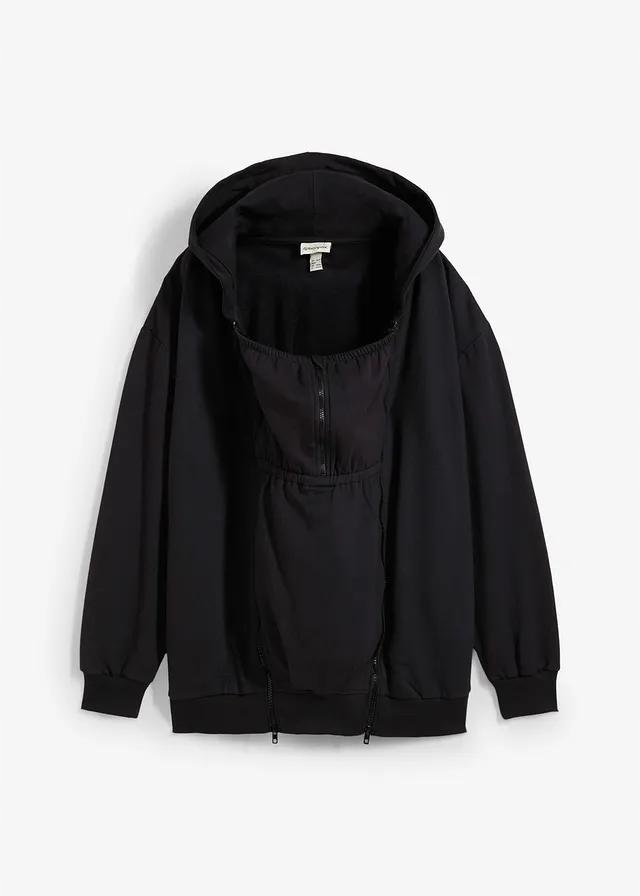 Черная кофта на молнии для беременных со вставкой-переноской и капюшоном – функциональный и удобный вариант для мам. Практичная вставка позволяет комфортно носить ребенка в переноске, а капюшон и конструкция на молнии обеспечивают дополнительную защиту от холода и полную свободу движений. Изготовленный из мягкого, приятного на ощупь материала, он идеально подходит для повседневного использования, во время прогулок и занятий с малышом. Черный цвет гарантирует универсальность и легкость сочетания с другими элементами гардероба.