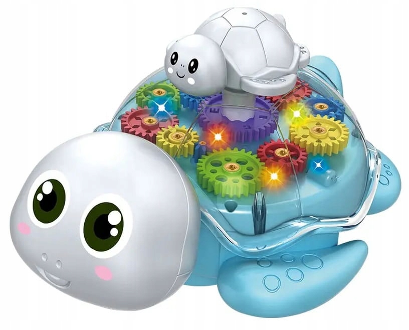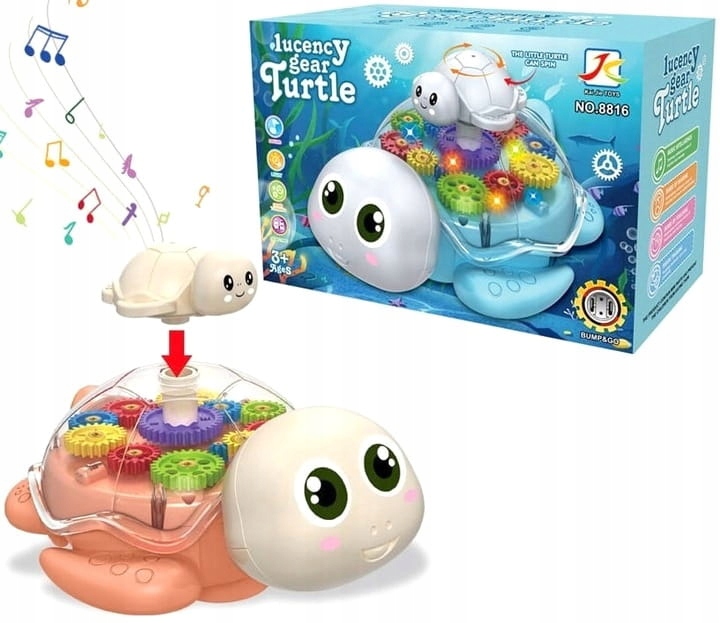 - У веселой черепахи прозрачный панцирь с разноцветными шестеренками внутри. Во время игры колесики вращаются, а внутренняя часть черепахи сверкает разноцветными огнями.