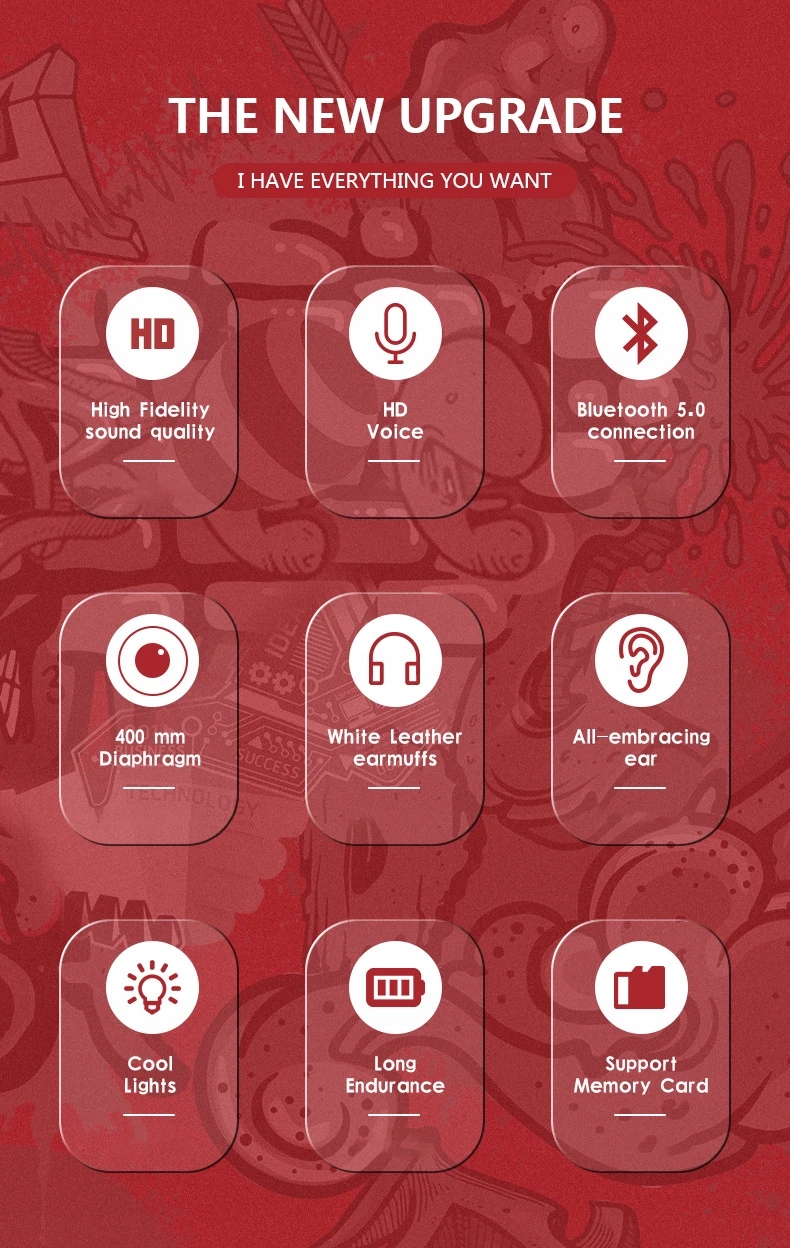 Наушники Graffiti расписаны граффити и контрастными цветами, линии простые, лаконичные и модные, чтобы избавиться от монотонности традиционных Bluetooth-гарнитур. Яркая яркая подсветка добавляет веселья во время игр.