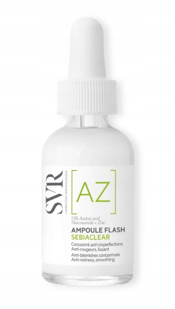 Чтобы найти наилучший баланс между эффективностью и переносимостью, Лаборатория СВР разработала рецептуру сыворотки, содержащей 15% азелаиновой кислоты, которая является признанным активным ингредиентом, обладающим противовоспалительным и кератолитическим действием. В сочетании с салициловой кислотой и ниацинамидом SEBIACLEAR Ampoule AZ Flash глубоко очищает поры и заметно уменьшает несовершенства и покраснения в рекордно короткие сроки. Его легкая молочная текстура легко впитывается, обеспечивая невидимый финиш. Кожа очищена, успокоена и наполнена комфортом.