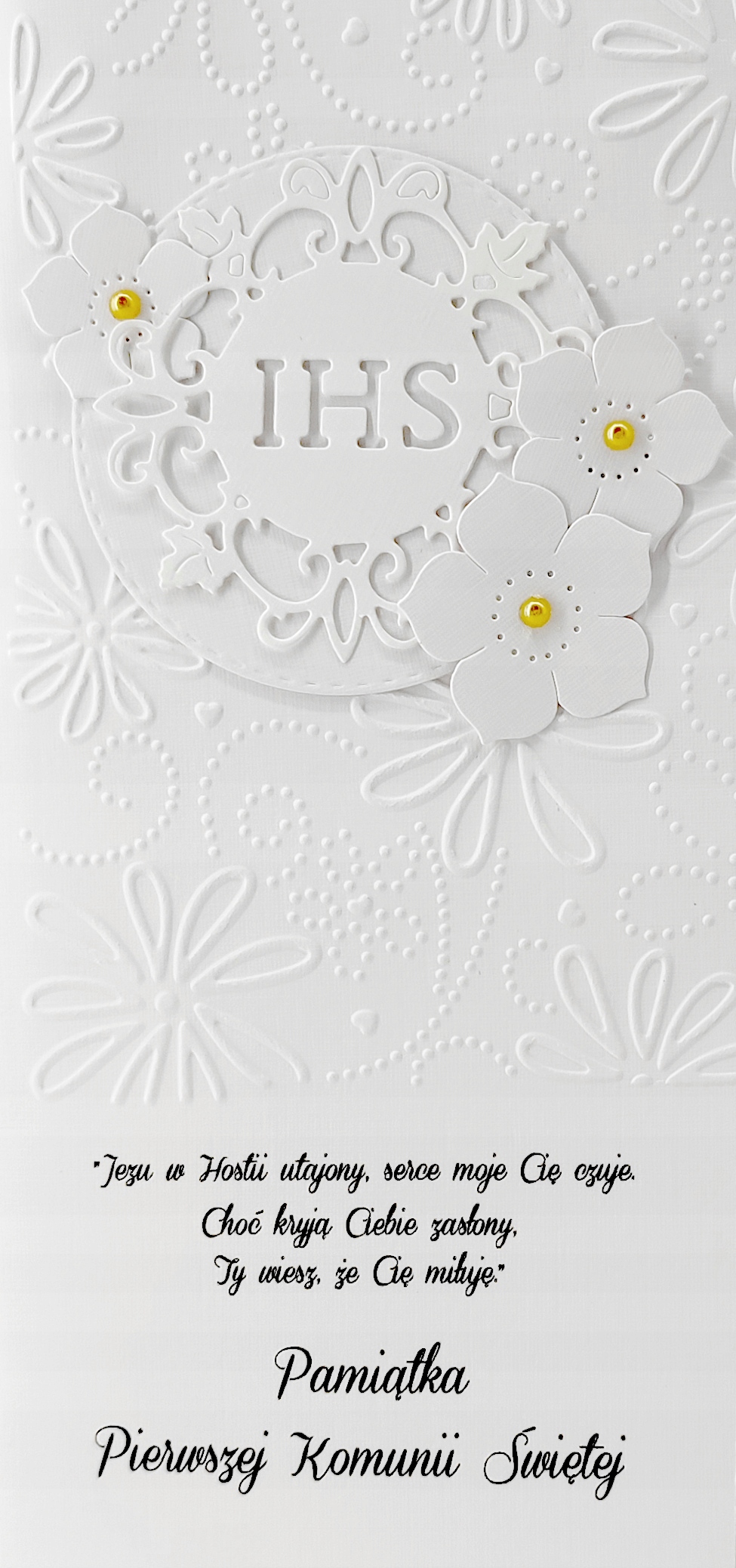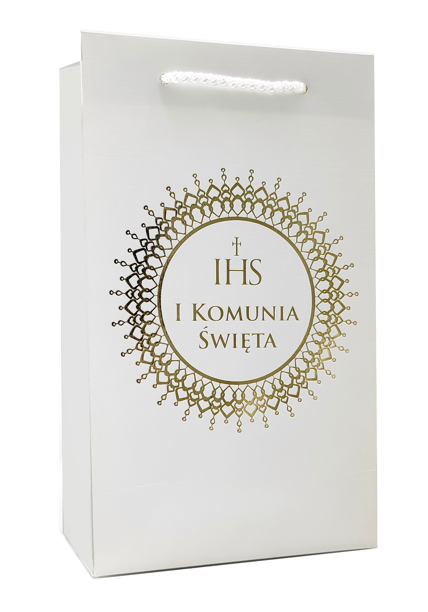Наш новый продукт, который идеально подходит для празднования первого святого причастия. Подарочный пакет характеризуется нежным белым оттенком и позолоченным украшением. У продукта есть надпись «первое святое причастие».