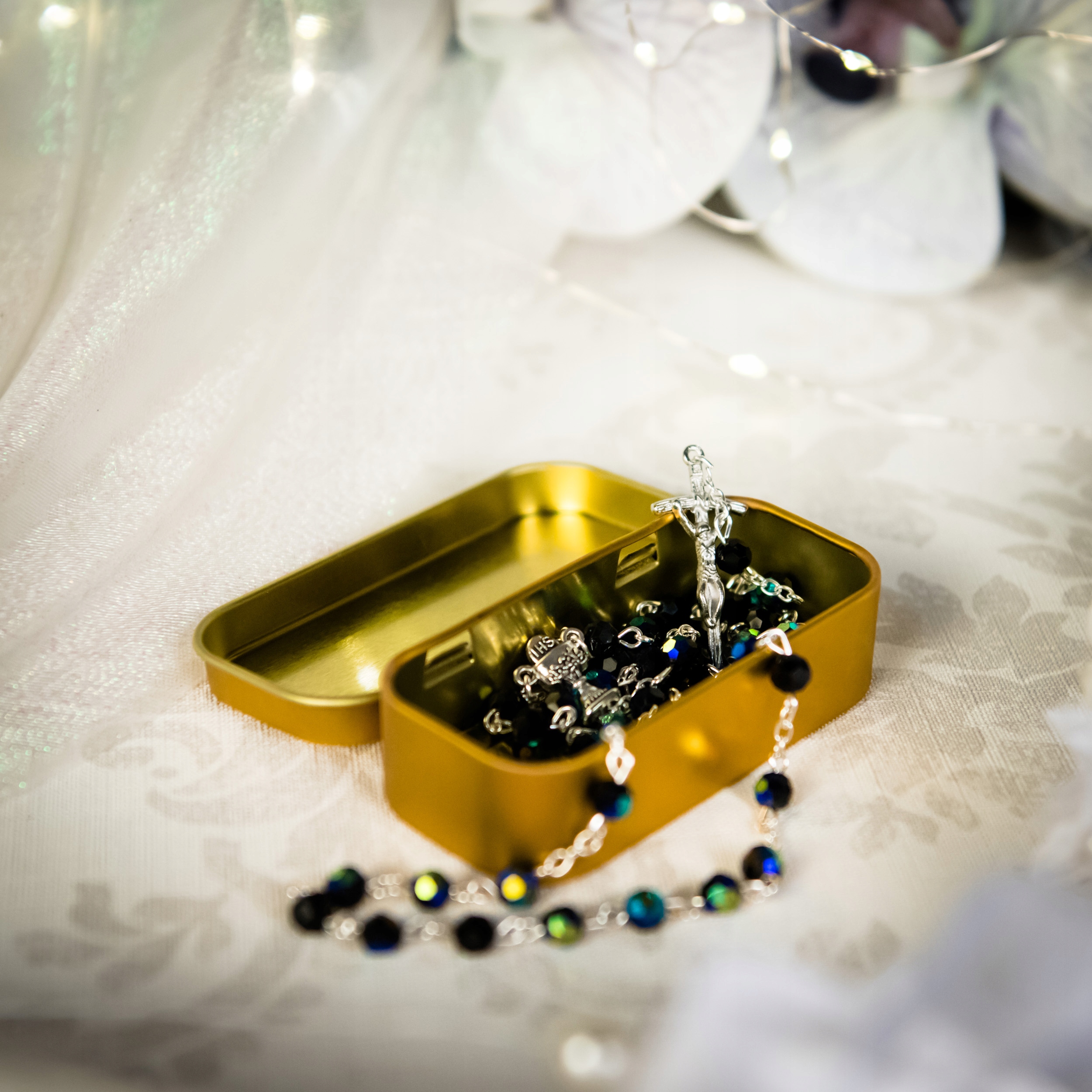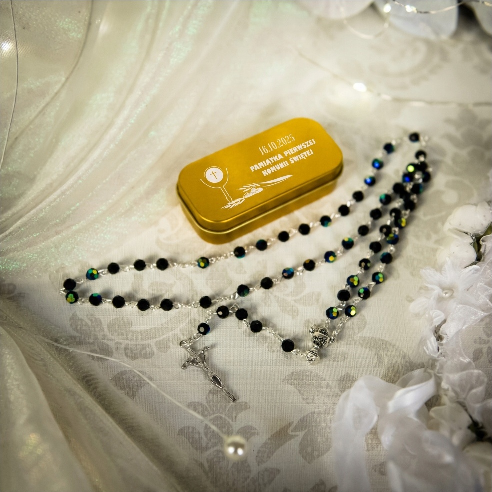 różaniec Wykonany Jest Z Opalizujących, Czarnych Koralików. Включен с розарием, золотой коробкой с исключительной гравировкой по случаю первого святого причастия, которое вы можете персонализировать!