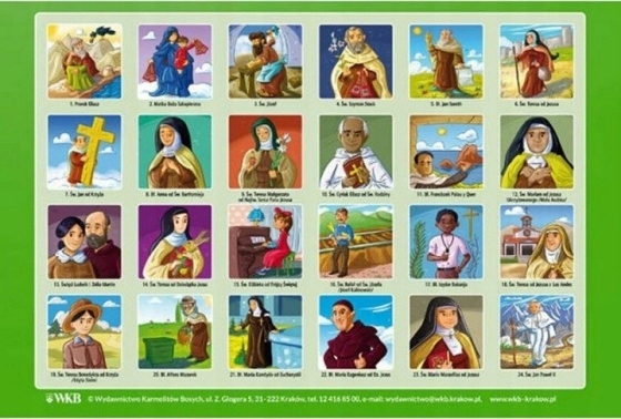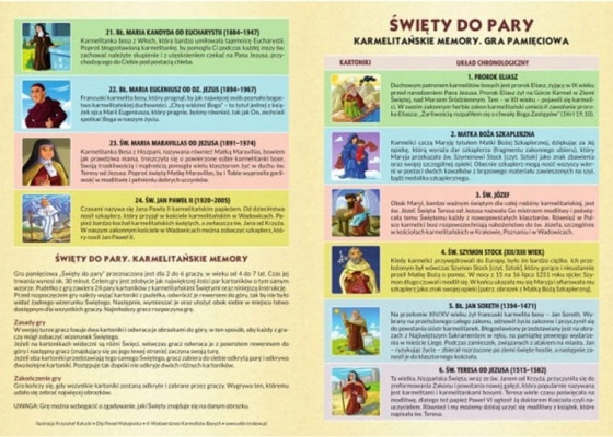 память «Святой в пар» предназначена для 2-6 игроков в возрасте от 4 до 99 лет. Его продолжительность составляет около 30 минут. Цель игры - получить столько пар картонных коробок с тем же рисунком. Игровая коробка содержит 24 пары картонных коробок с кармелитными святыми и инструкциями.
