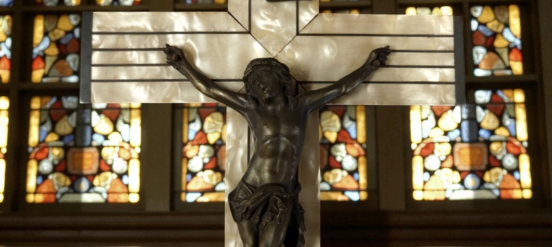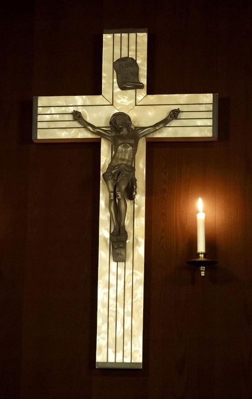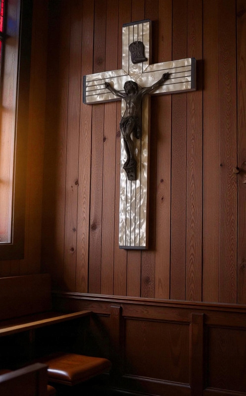 Крест изготовлен около 50 лет назад из дерева и покрыт спереди слоем перламутра, а фигура Иисуса выполнена из металлического сплава.