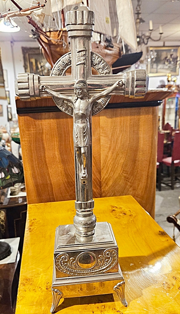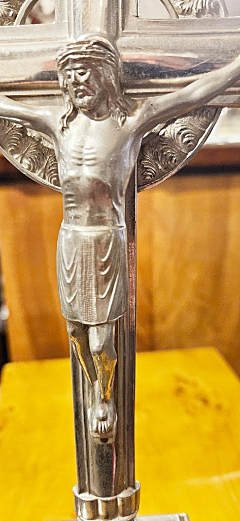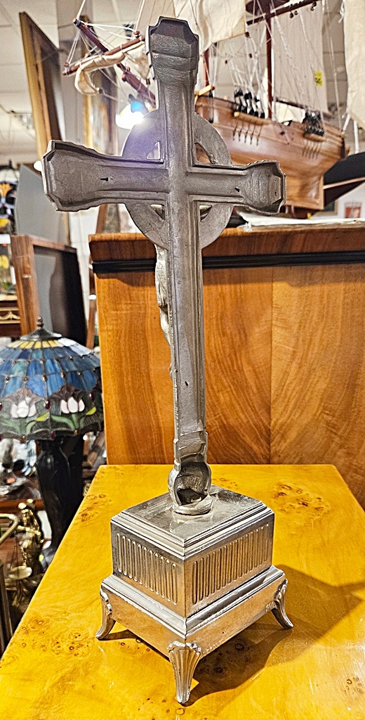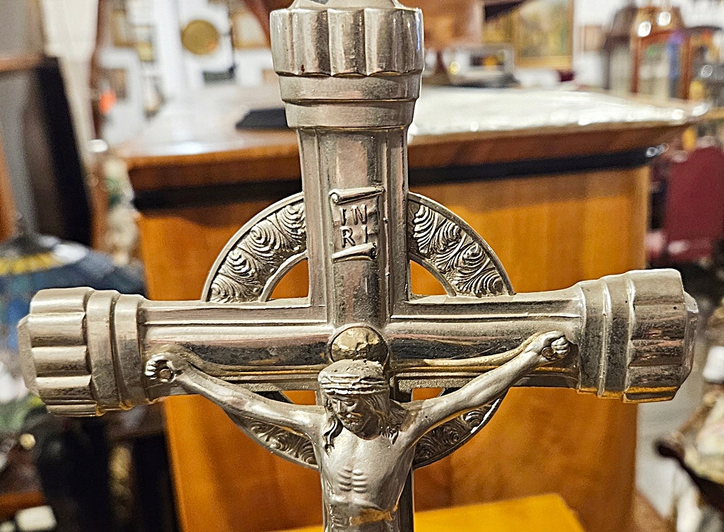 Серебряный металлический крест, используемый в хорошем состоянии. Он представляет распятый Иисуса Христа. Очень привлекательное, тонкое выступление, несомненно, может быть великим случайным даром или символом дома для каждого католика, говорящего о своей вере.