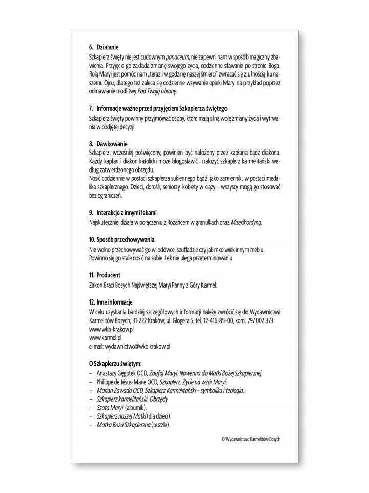 8. Дозировка, ранее выделенная, должна применяться священником или дьяконом. Каждый священник и католический дьякон могут благословить и наносить лопасть кармелита в соответствии с утвержденным обрядом. Рассчитайте каждый день в форме лопатки ткани или в качестве заменителя в виде лопаточной медаль. Дети, взрослые, пожилые люди, беременные женщины - каждый может использовать его без ограничений.