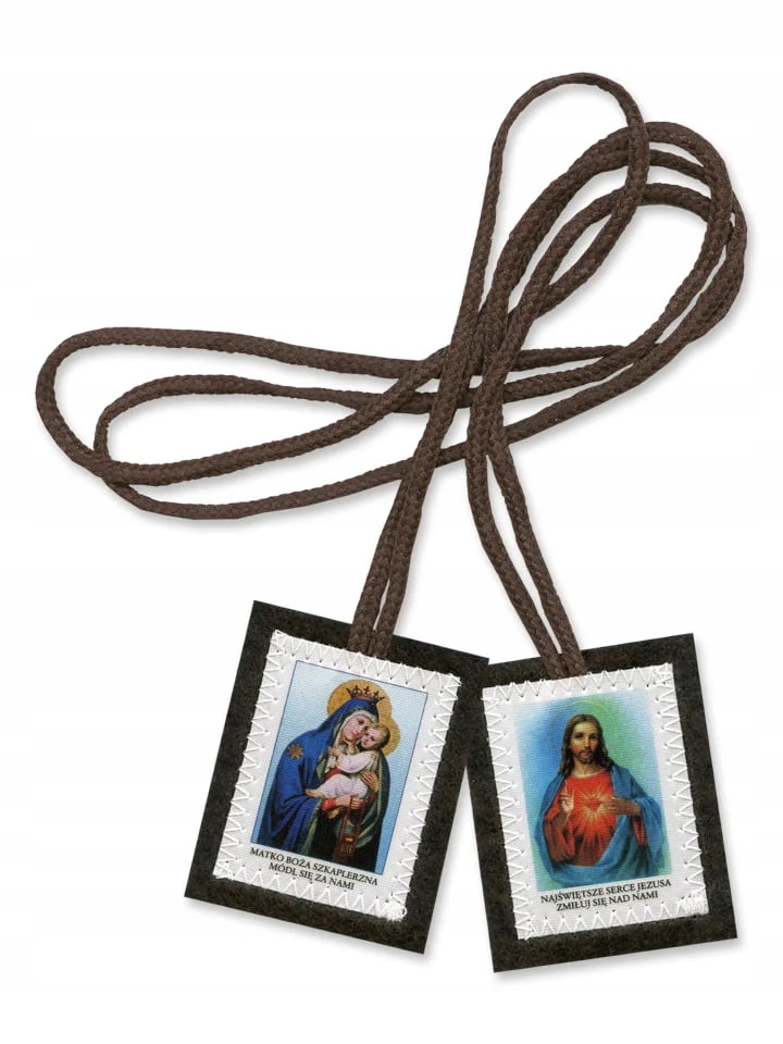 3. Как выглядит лопатка ткани и как упаковка связана с струнами коричневой ткани с изображениями матери Божьей и сердцем Иисуса, которые защитят спину и грудь.