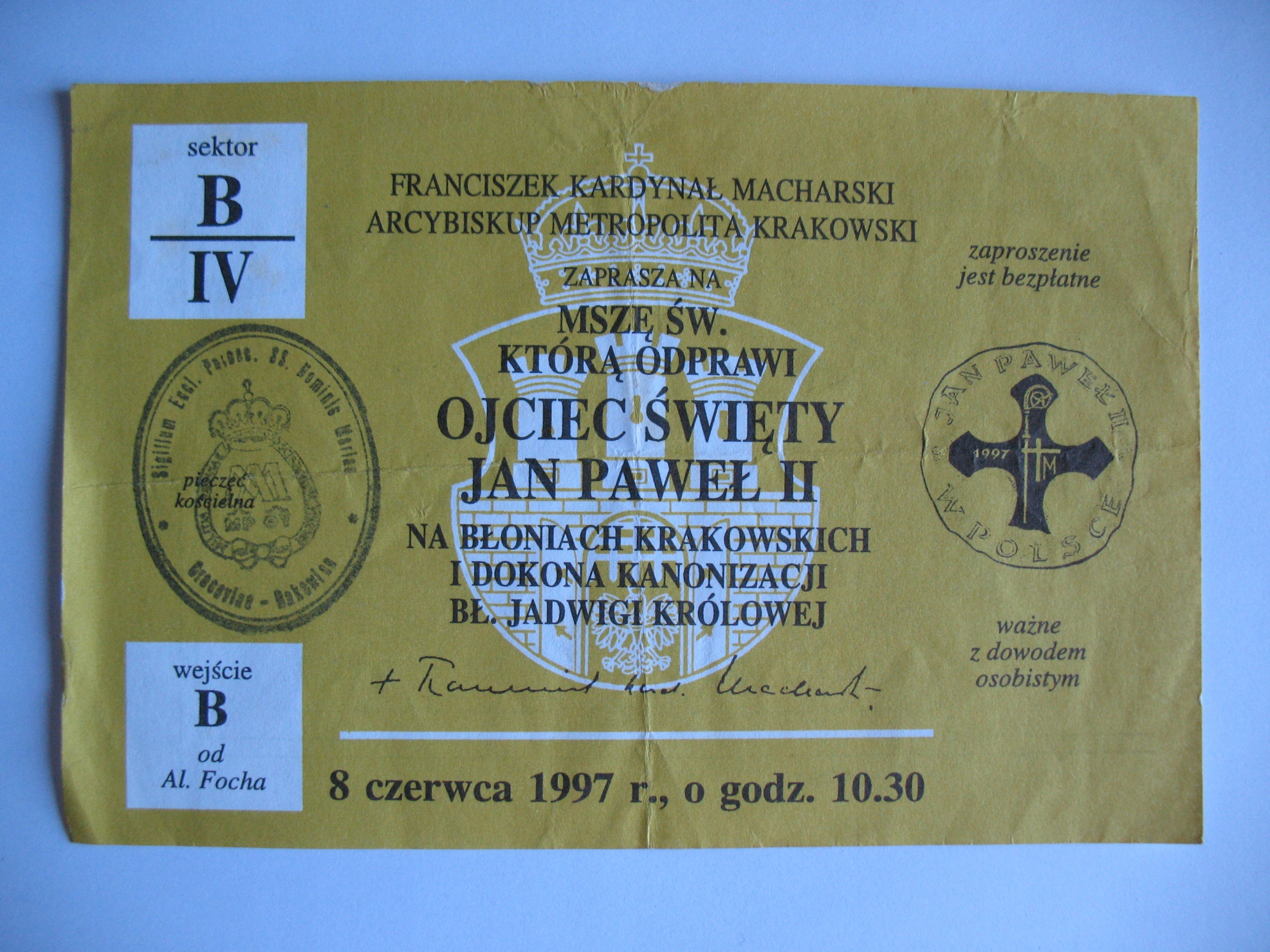 Святой отец Иоанн Павел II Билет на Святую Мессу в Кракове 1997