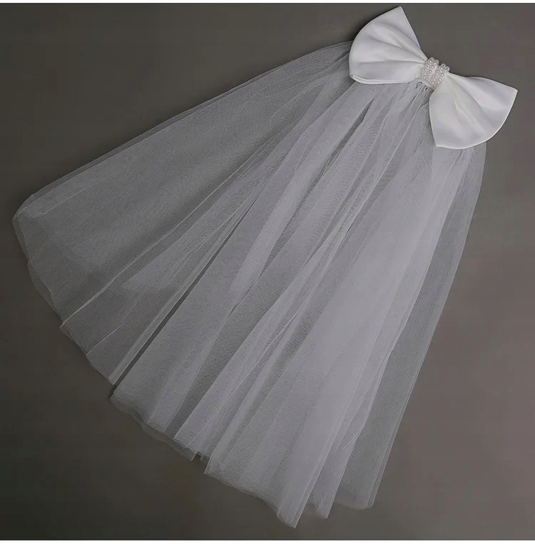 Бант сзади прикрепляется булавкой, к нему прикрепляется дополнительная тюлевая вуаль.